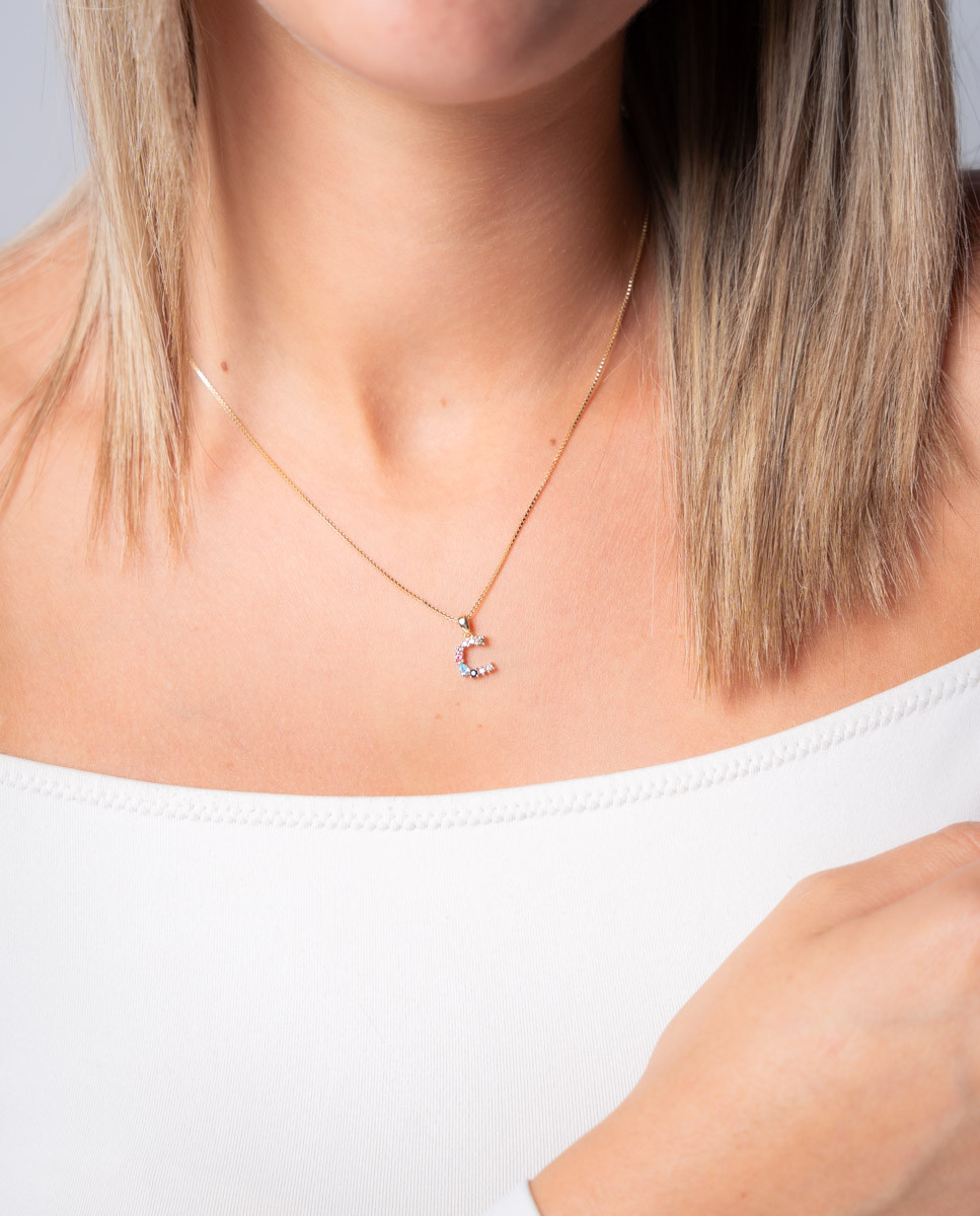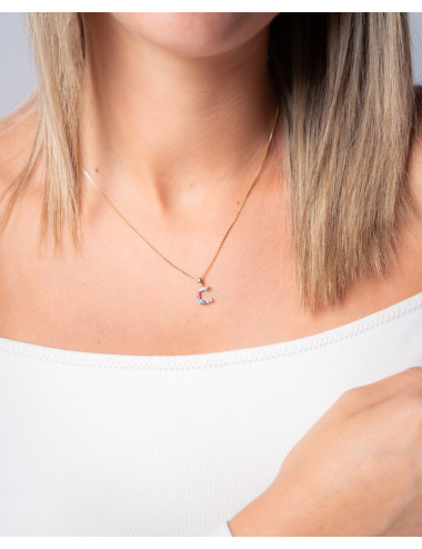 Colgante de plata de ley 925 bañada en oro con inicial C de aproximadamente 5 mm x 10 mm (ancho por alto) y circonitas multicolor. Cadena de 40 cms de largo más 5 cms de alargador y cierre tipo mosquetón.