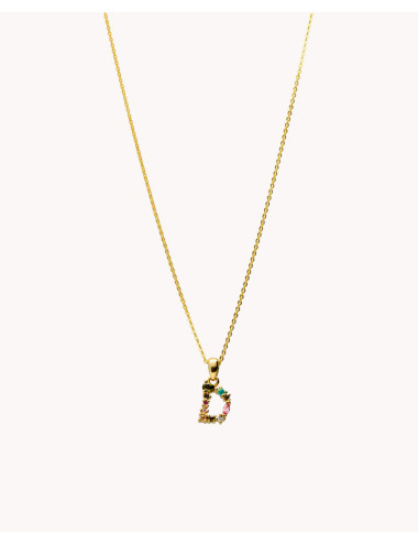 Colgante de plata de ley 925 bañada en oro con inicial D de aproximadamente 5 mm x 10 mm (ancho por alto) y circonitas multicolor. Cadena de 40 cms de largo más 5 cms de alargador y cierre tipo mosquetón.