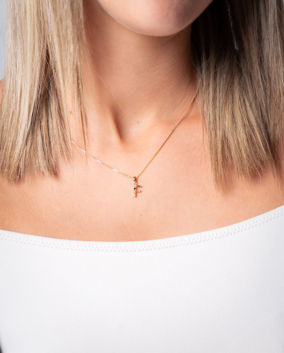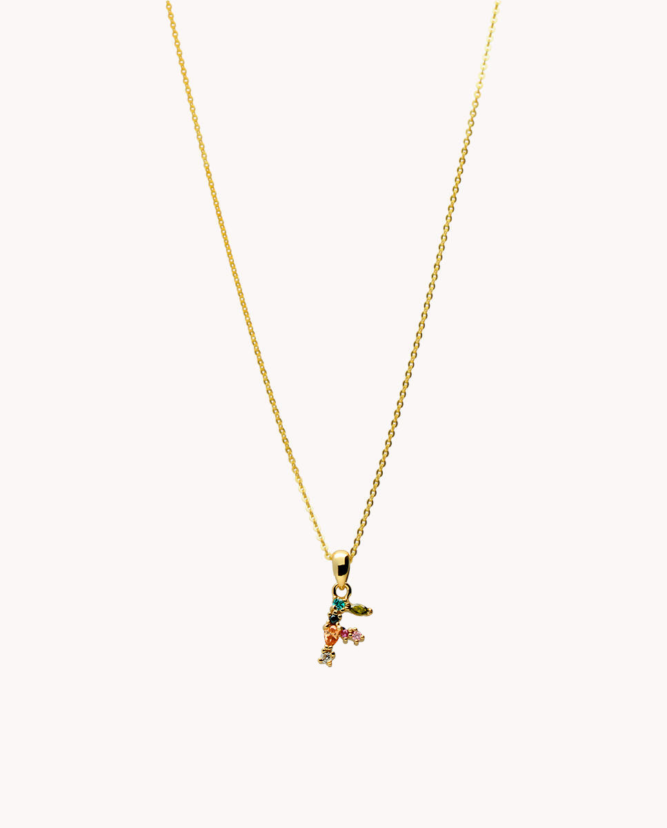Colgante de plata de ley 925 bañada en oro con inicial F de aproximadamente 5 mm x 10 mm (ancho por alto) y circonitas multicolor. Cadena de 40 cms de largo más 5 cms de alargador y cierre tipo mosquetón.