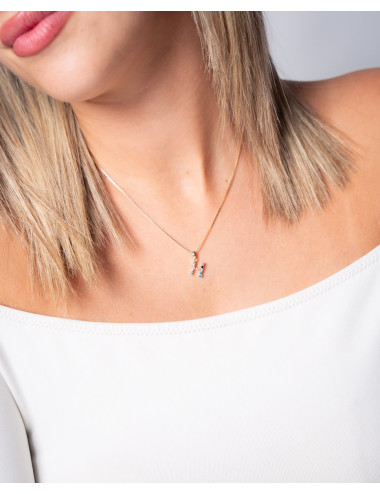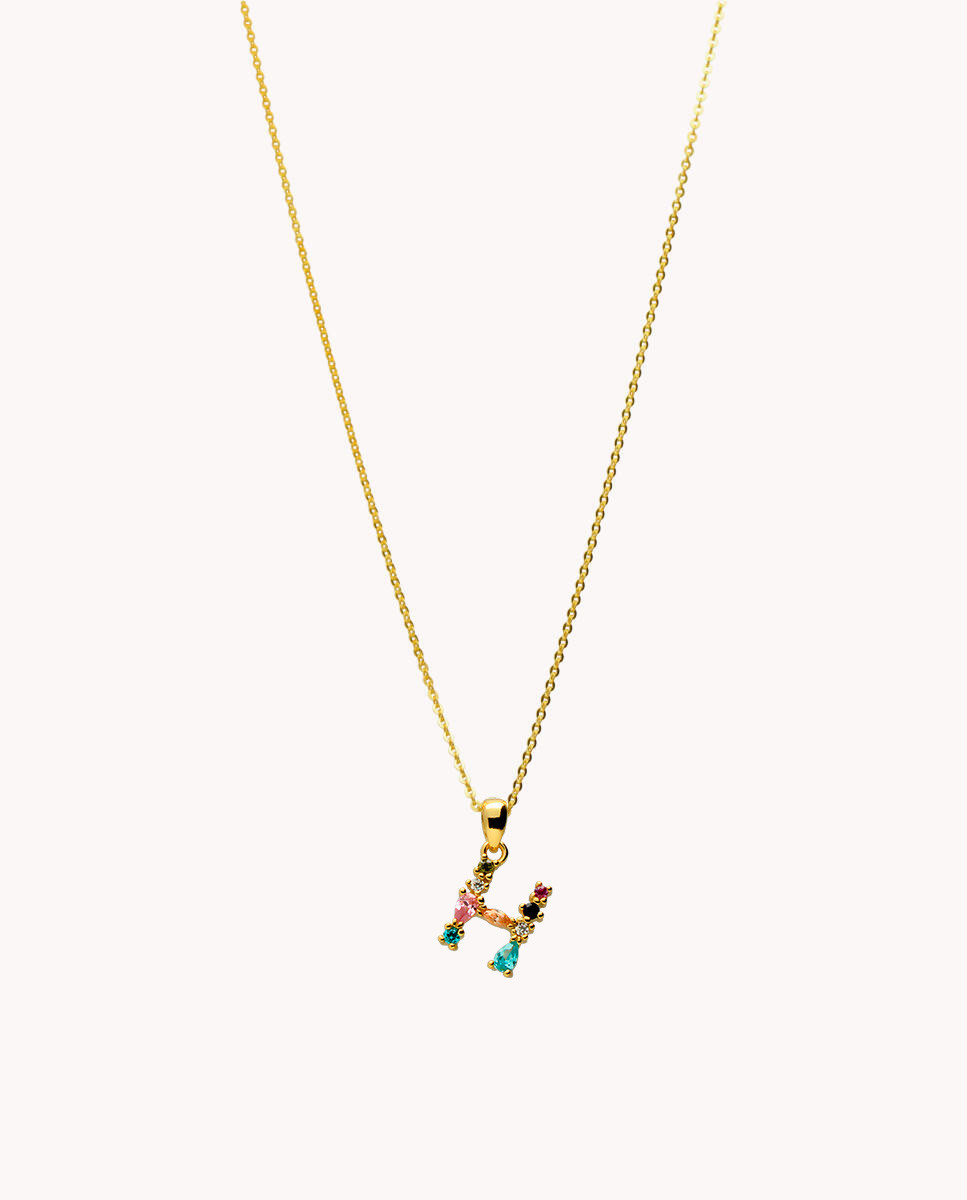 Colgante de plata de ley 925 bañada en oro con inicial H de aproximadamente 5 mm x 10 mm (ancho por alto) y circonitas multicolor. Cadena de 40 cms de largo más 5 cms de alargador y cierre tipo mosquetón.