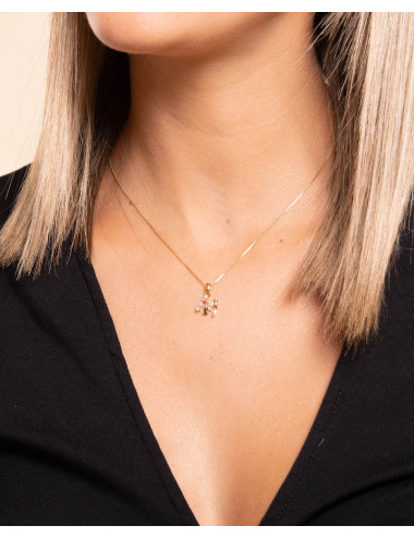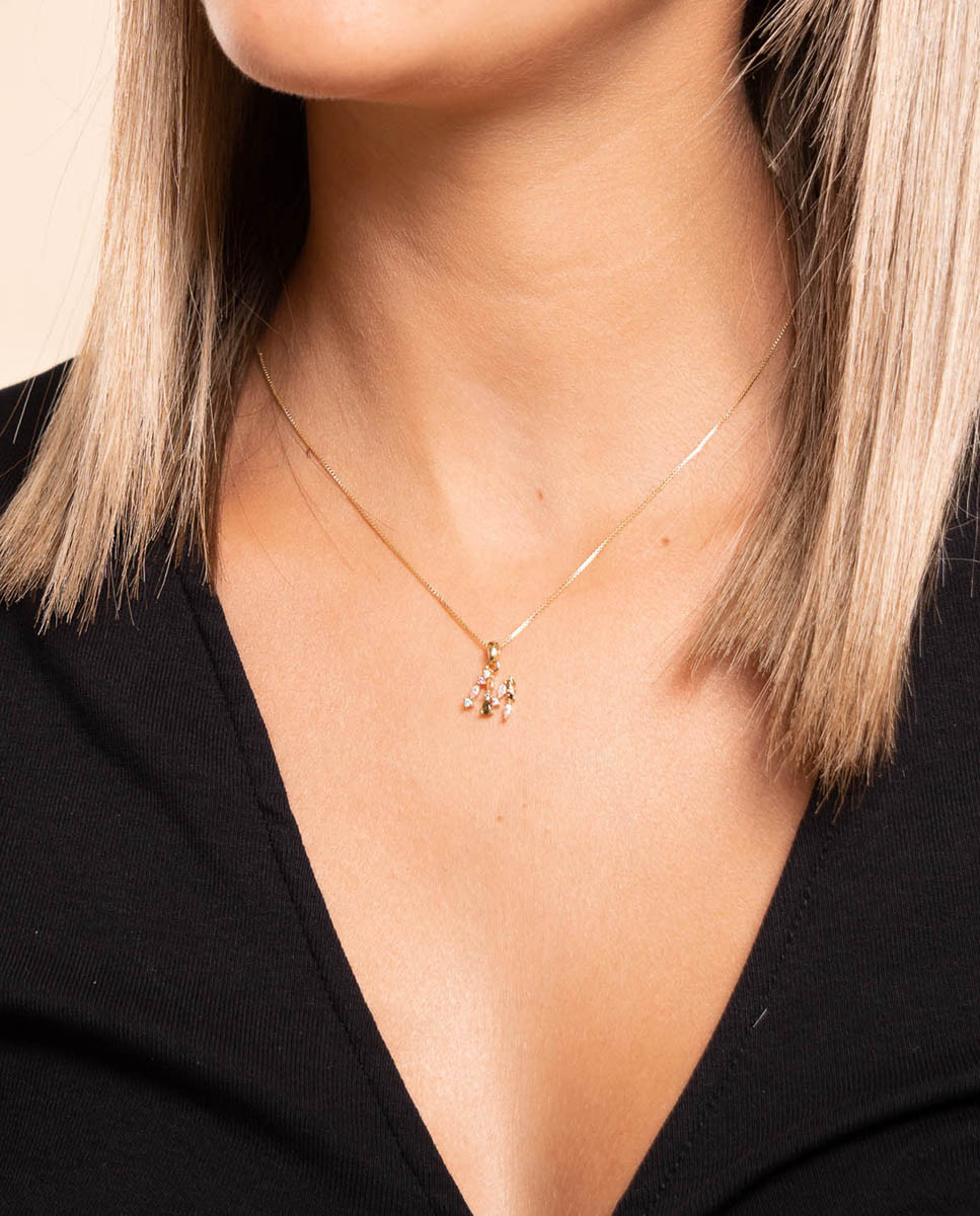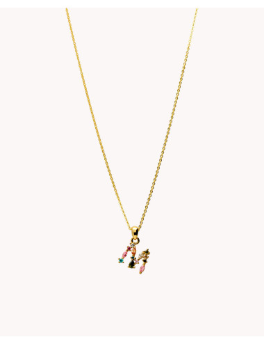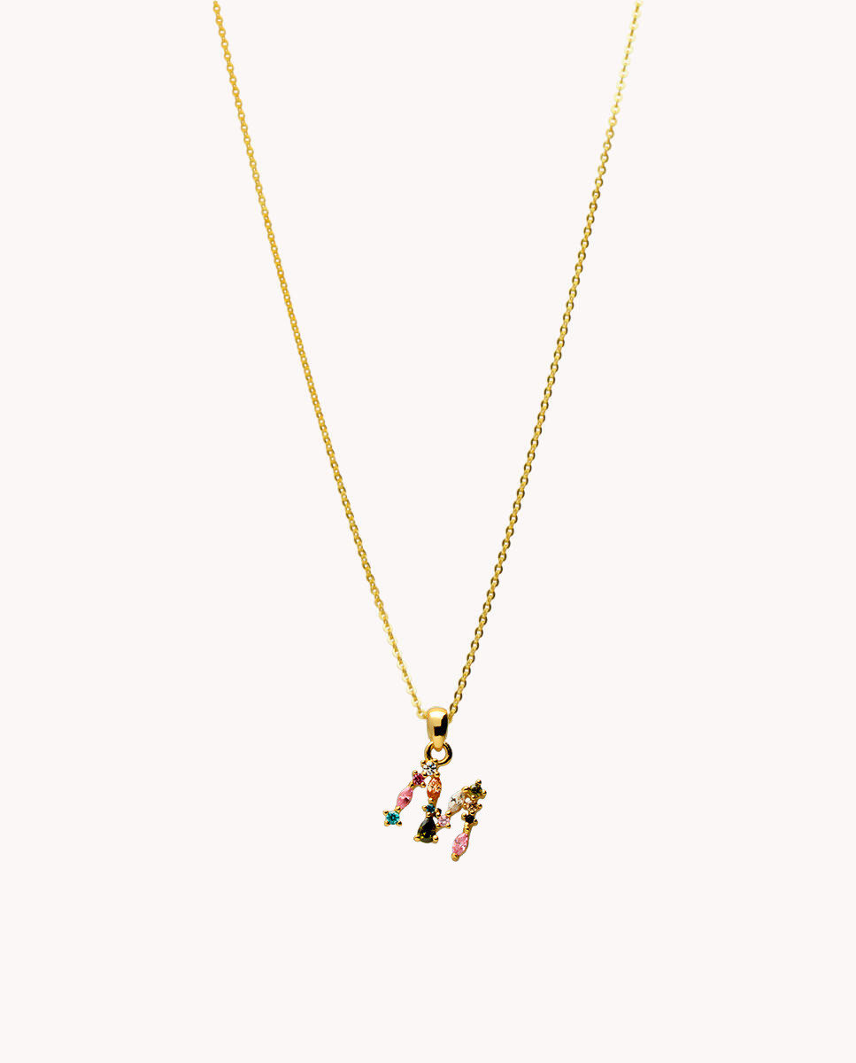 Colgante de plata de ley 925 bañada en oro con inicial M de aproximadamente 5 mm x 10 mm (ancho por alto) y circonitas multicolor. Cadena de 40 cms de largo más 5 cms de alargador y cierre tipo mosquetón.