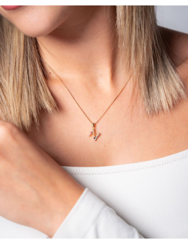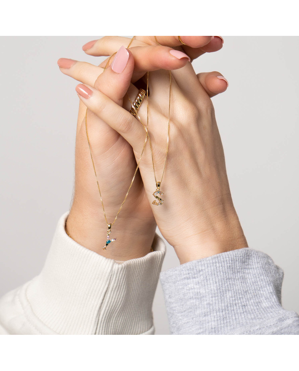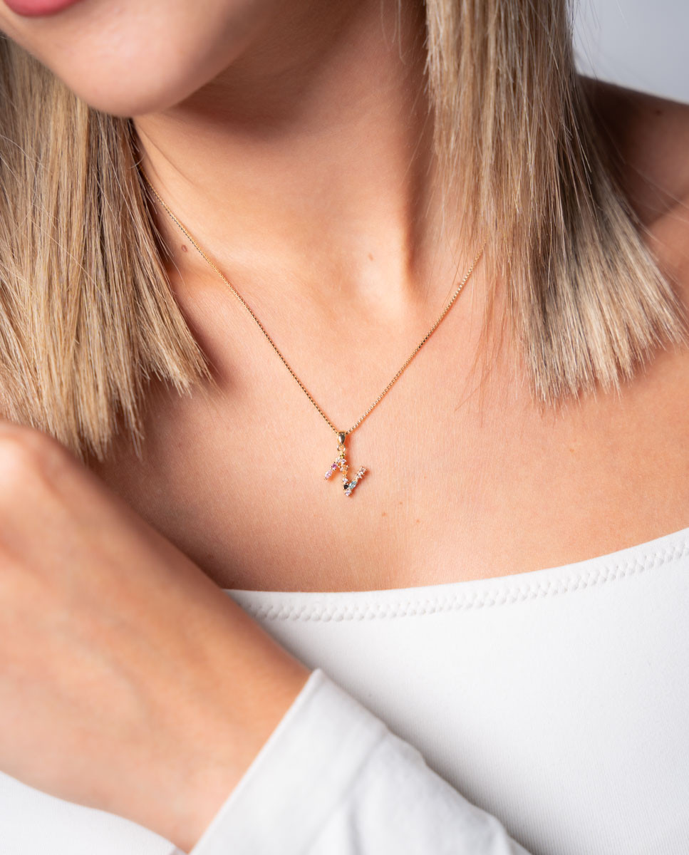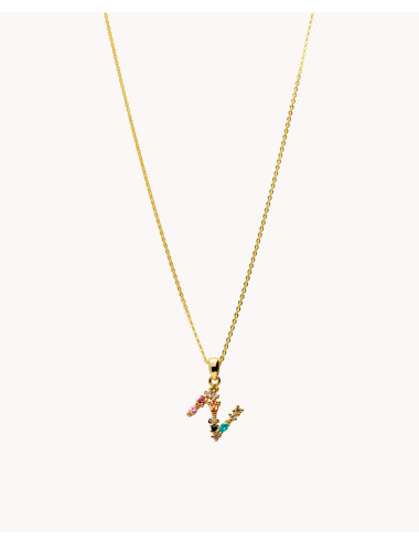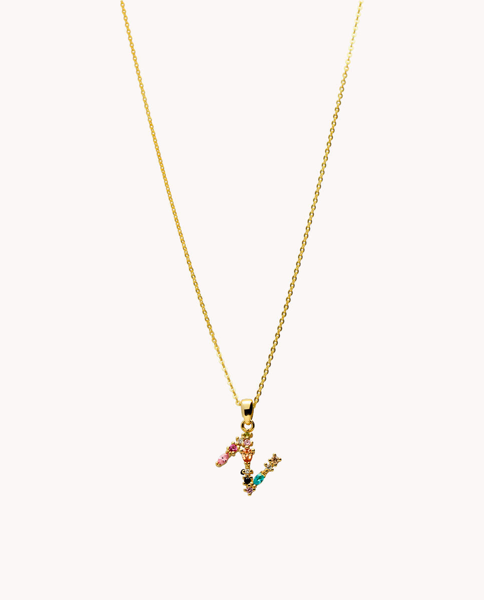 Colgante de plata de ley 925 bañada en oro con inicial N de aproximadamente 5 mm x 10 mm (ancho por alto) y circonitas multicolor. Cadena de 40 cms de largo más 5 cms de alargador y cierre tipo mosquetón.