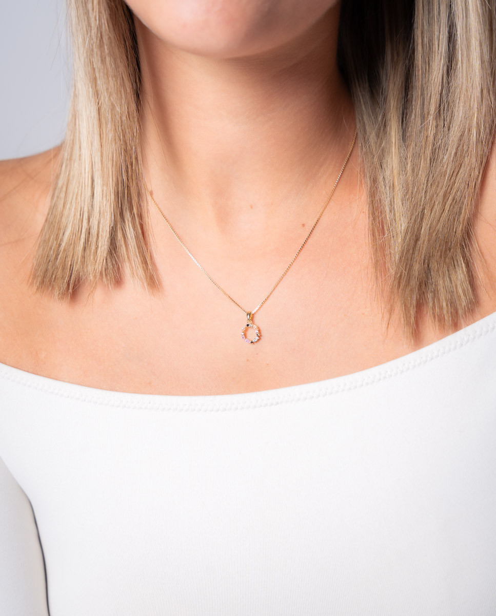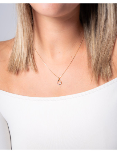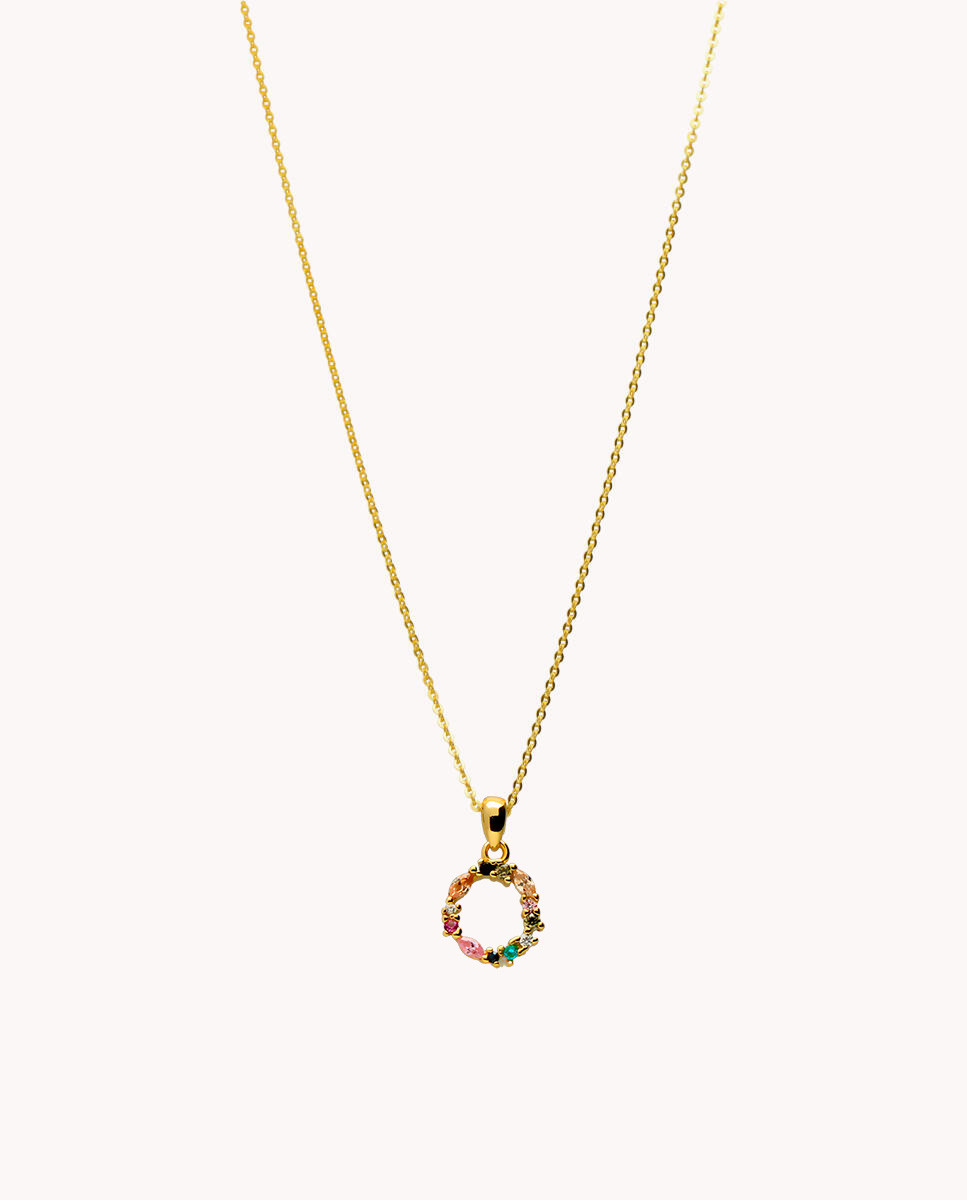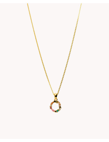 Colgante de plata de ley 925 bañada en oro con inicial O de aproximadamente 5 mm x 10 mm (ancho por alto) y circonitas multicolor. Cadena de 40 cms de largo más 5 cms de alargador y cierre tipo mosquetón.