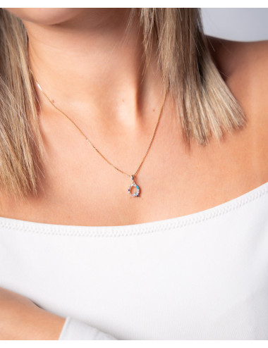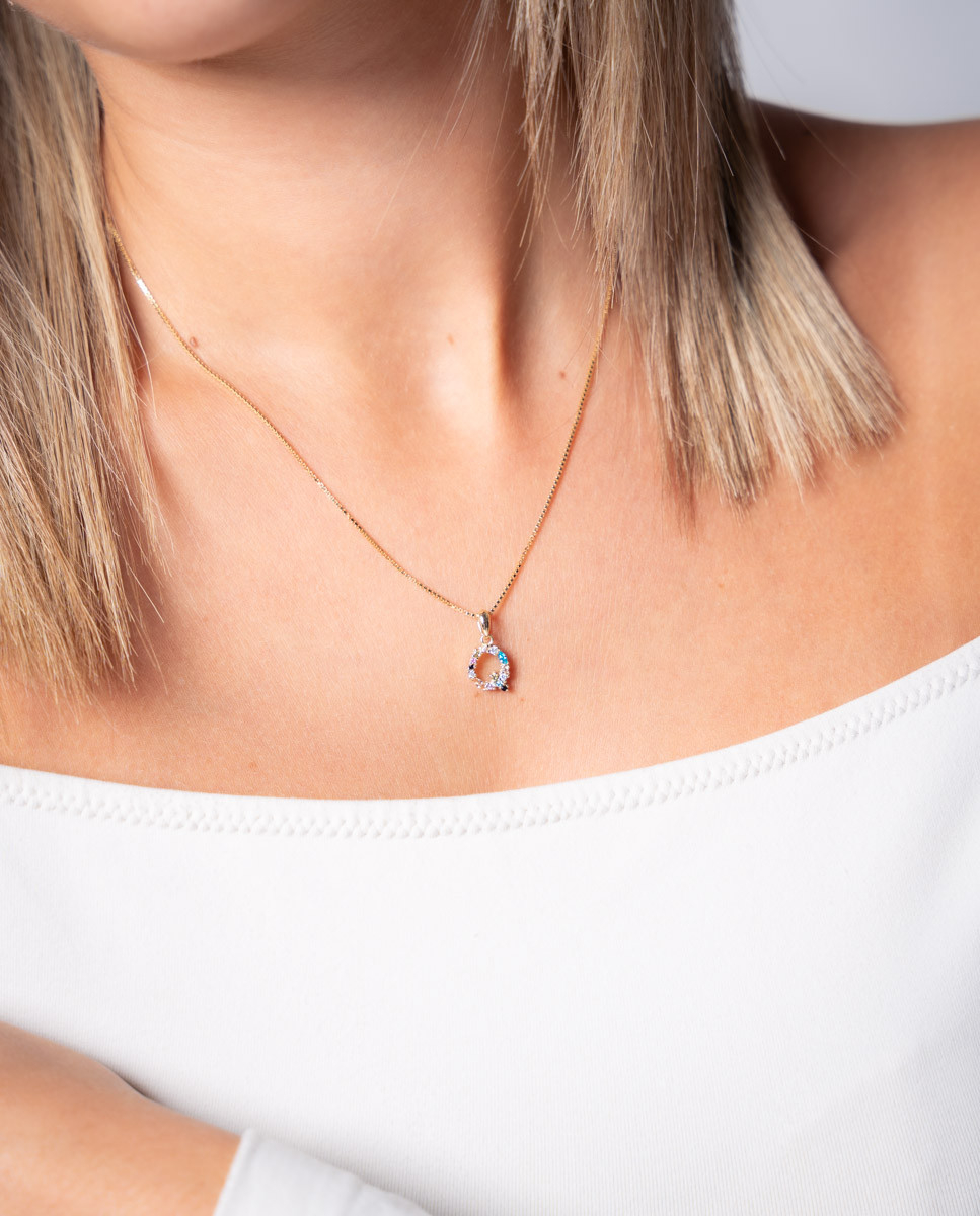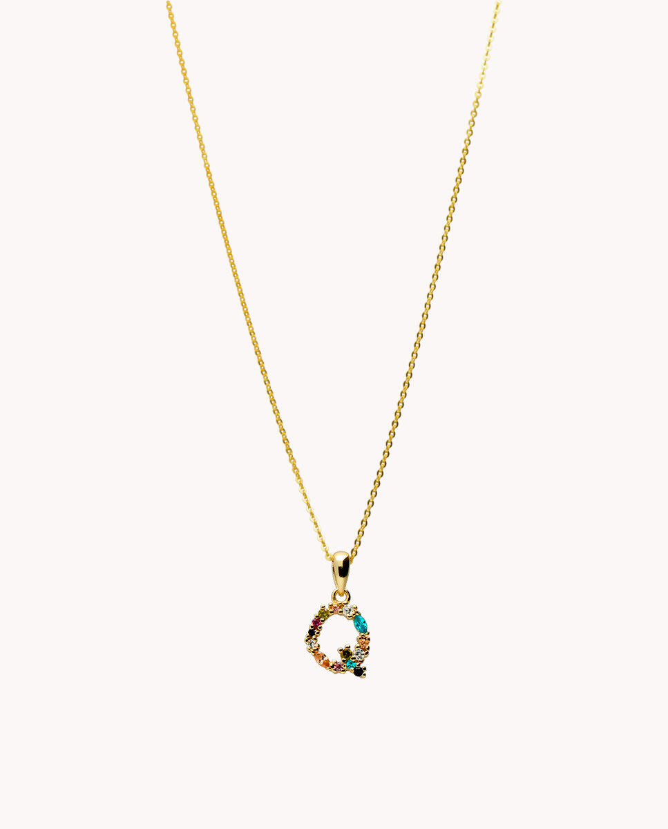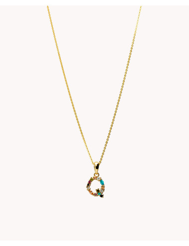 Colgante de plata de ley 925 bañada en oro con inicial Q de aproximadamente 5 mm x 10 mm (ancho por alto) y circonitas multicolor. Cadena de 40 cms de largo más 5 cms de alargador y cierre tipo mosquetón.