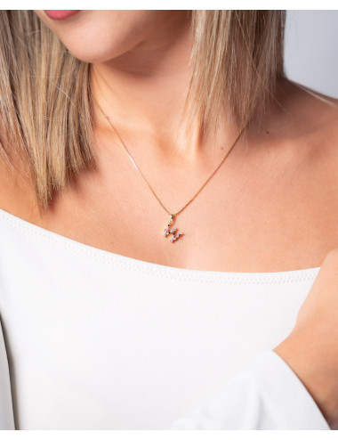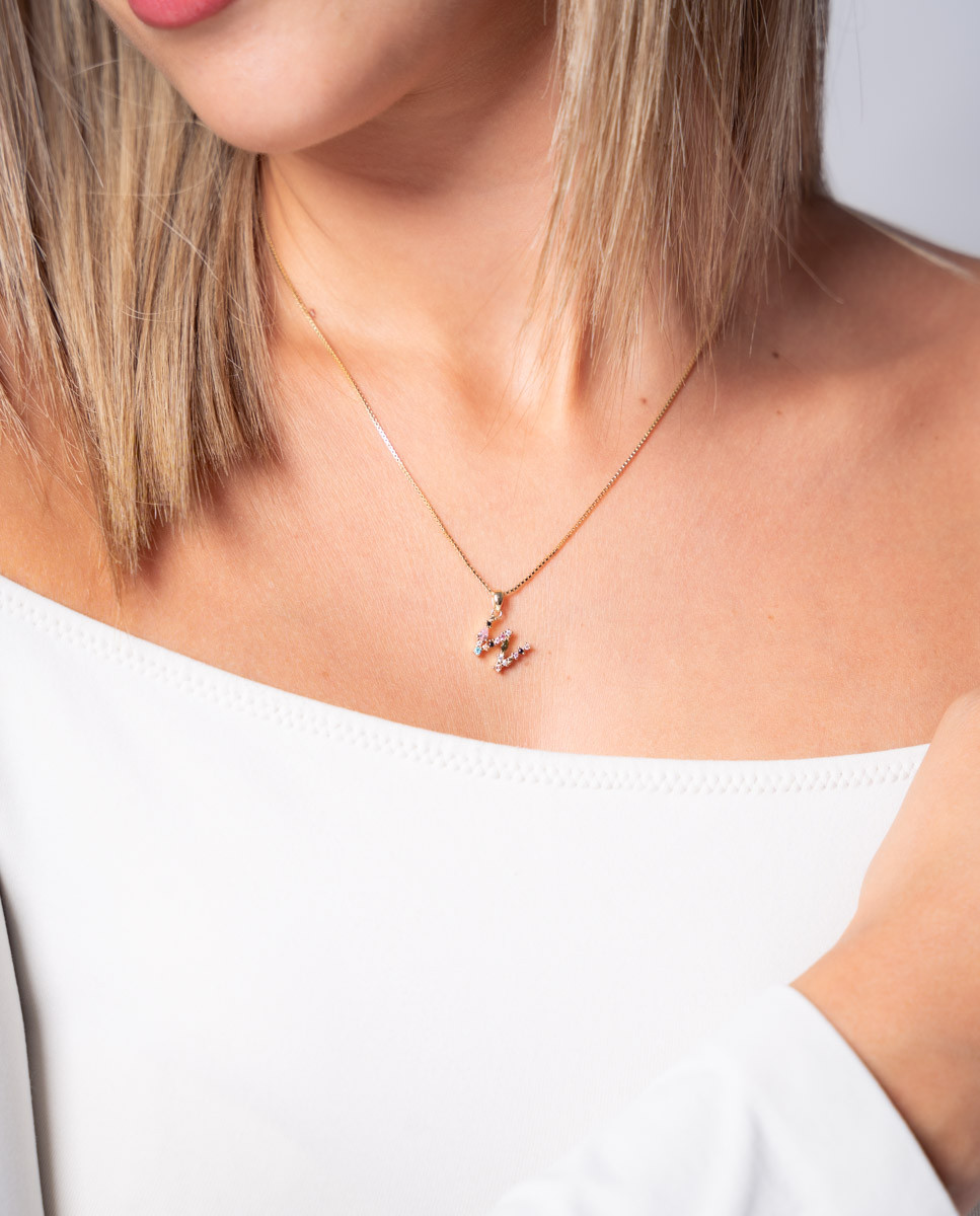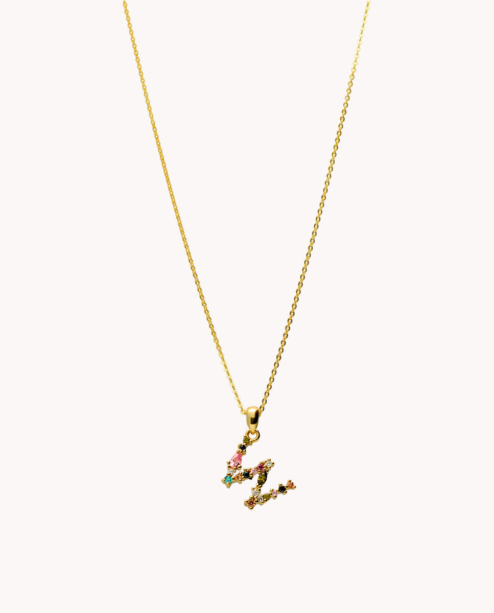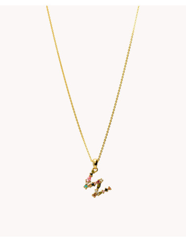 Colgante de plata de ley 925 bañada en oro con inicial W de aproximadamente 5 mm x 10 mm (ancho por alto) y circonitas multicolor. Cadena de 40 cms de largo más 5 cms de alargador y cierre tipo mosquetón.