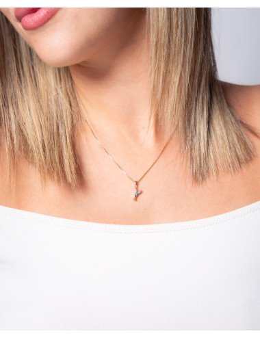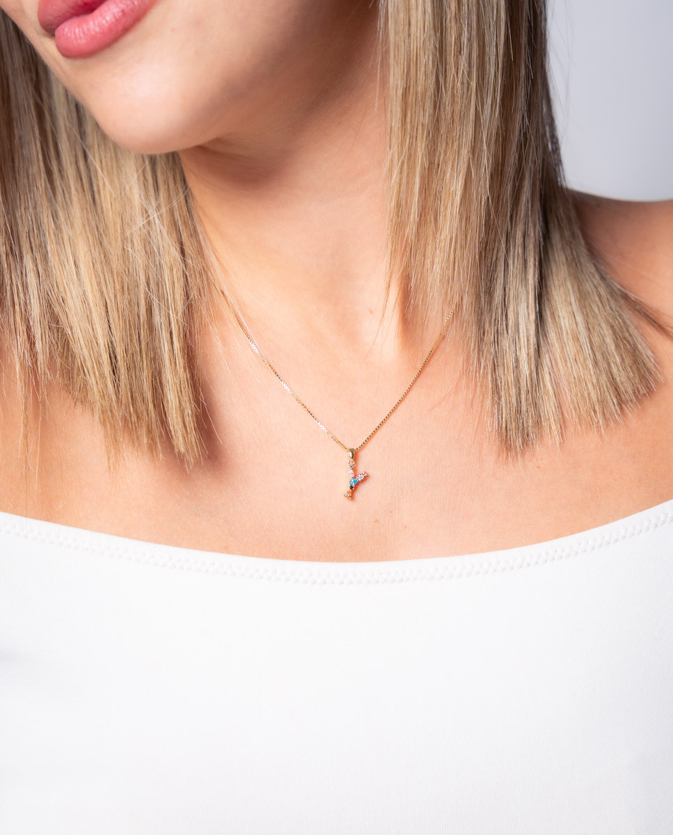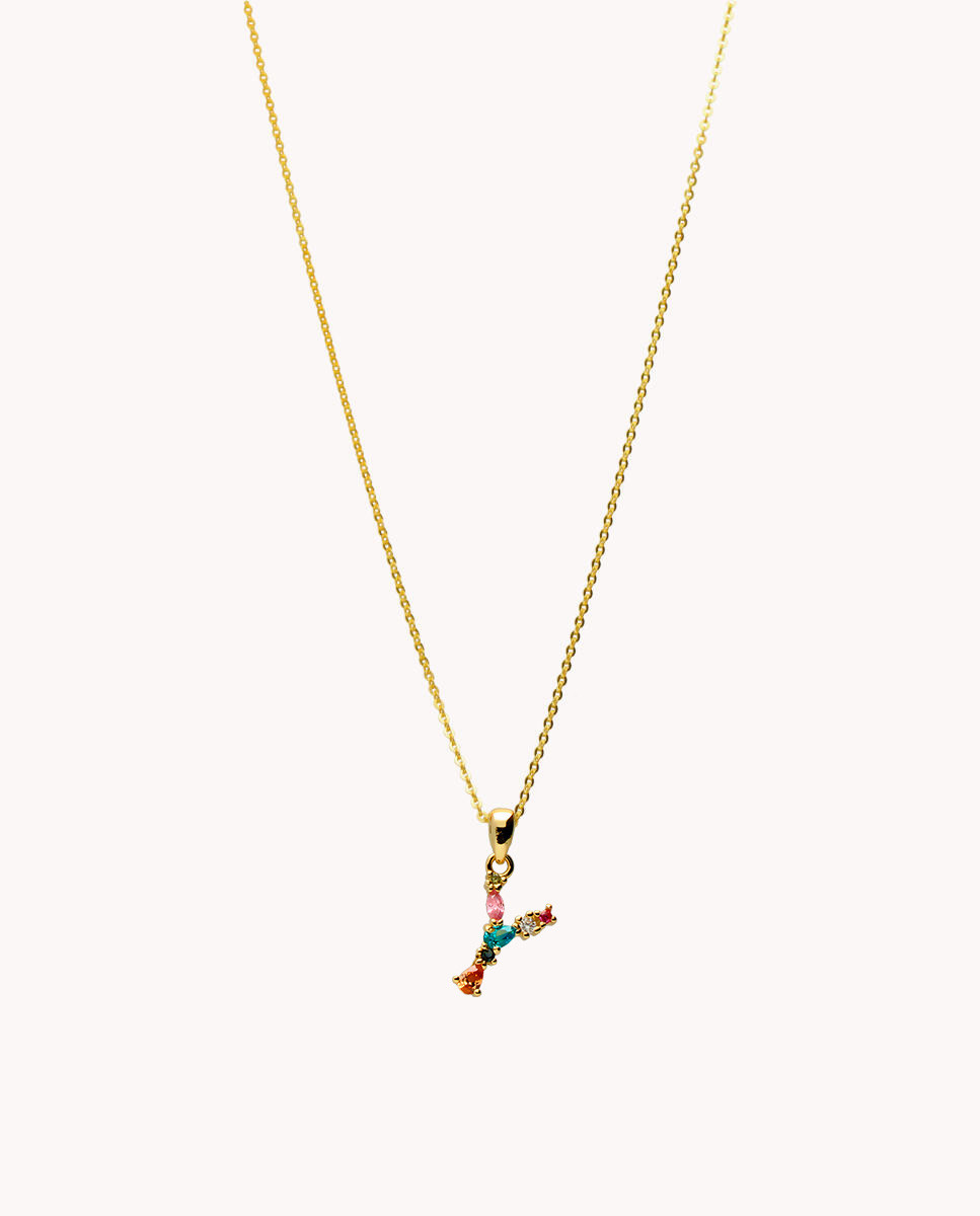 Colgante de plata de ley 925 bañada en oro con inicial Y de aproximadamente 5 mm x 10 mm (ancho por alto) y circonitas multicolor. Cadena de 40 cms de largo más 5 cms de alargador y cierre tipo mosquetón.