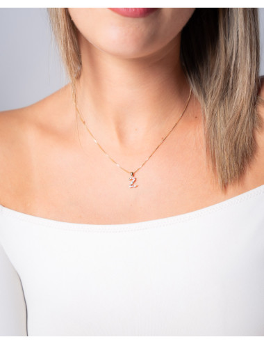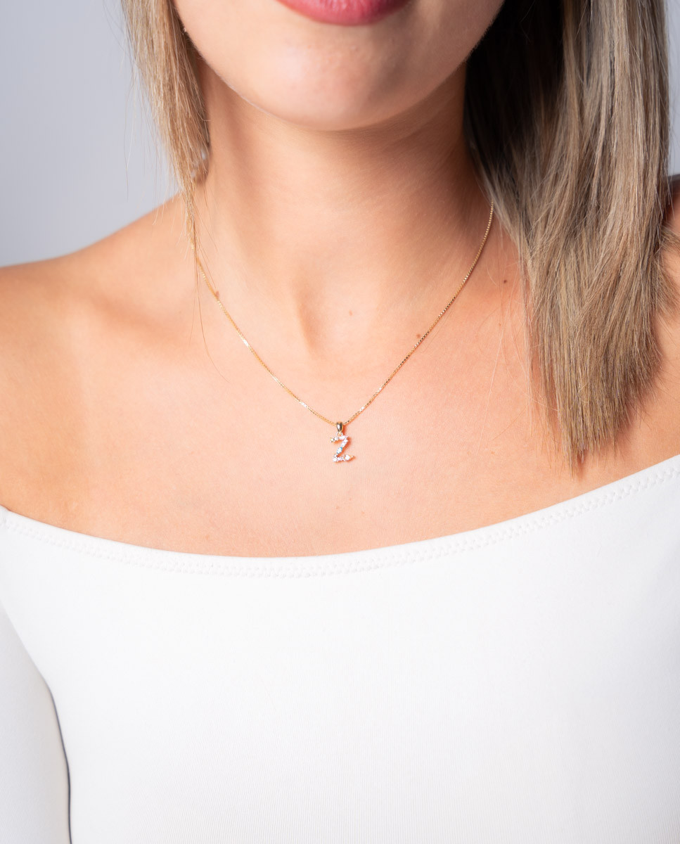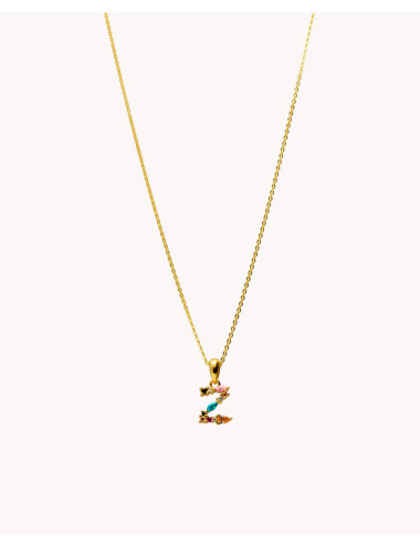Colgante de plata de ley 925 bañada en oro con inicial Z de aproximadamente 5 mm x 10 mm (ancho por alto) y circonitas multicolor. Cadena de 40 cms de largo más 5 cms de alargador y cierre tipo mosquetón.