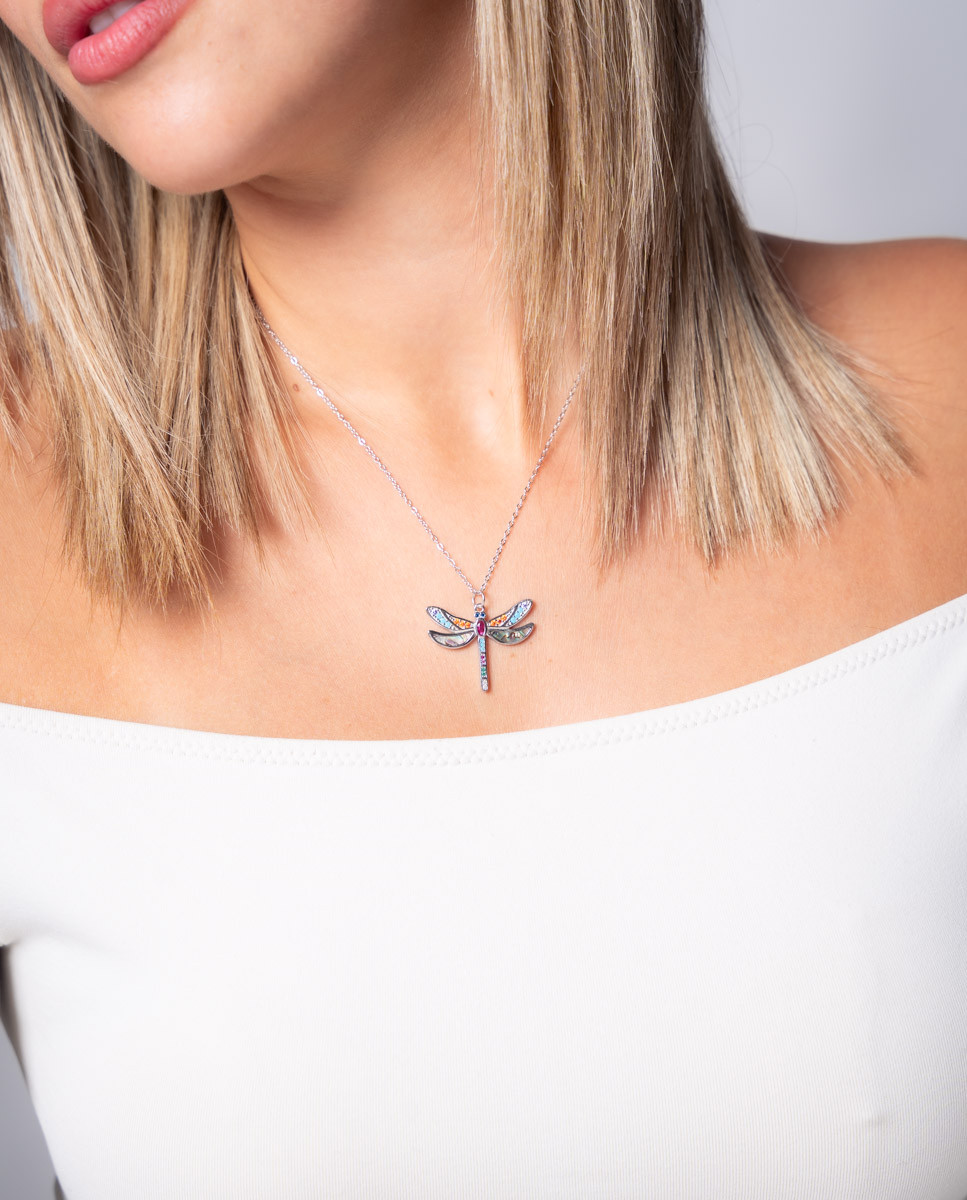 Colgante de plata de ley 925 bañada en rodio de libélula con circonitas multicolor y nácar de 28 mm x 21 mm (ancho por alto), cadena de 40 cms más 5,5 cms de alargador y cierre de mosquetón.