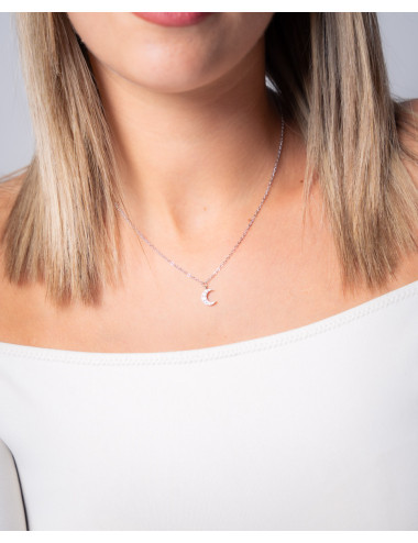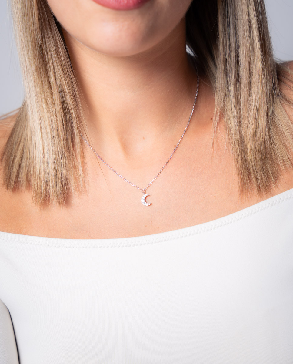 Colgante de plata de ley 925 bañada en rodio con luna de circonitas blancas de 9 mm de alto, cadena de 40 cms más 5 cms de alargador y cierre de mosquetón.