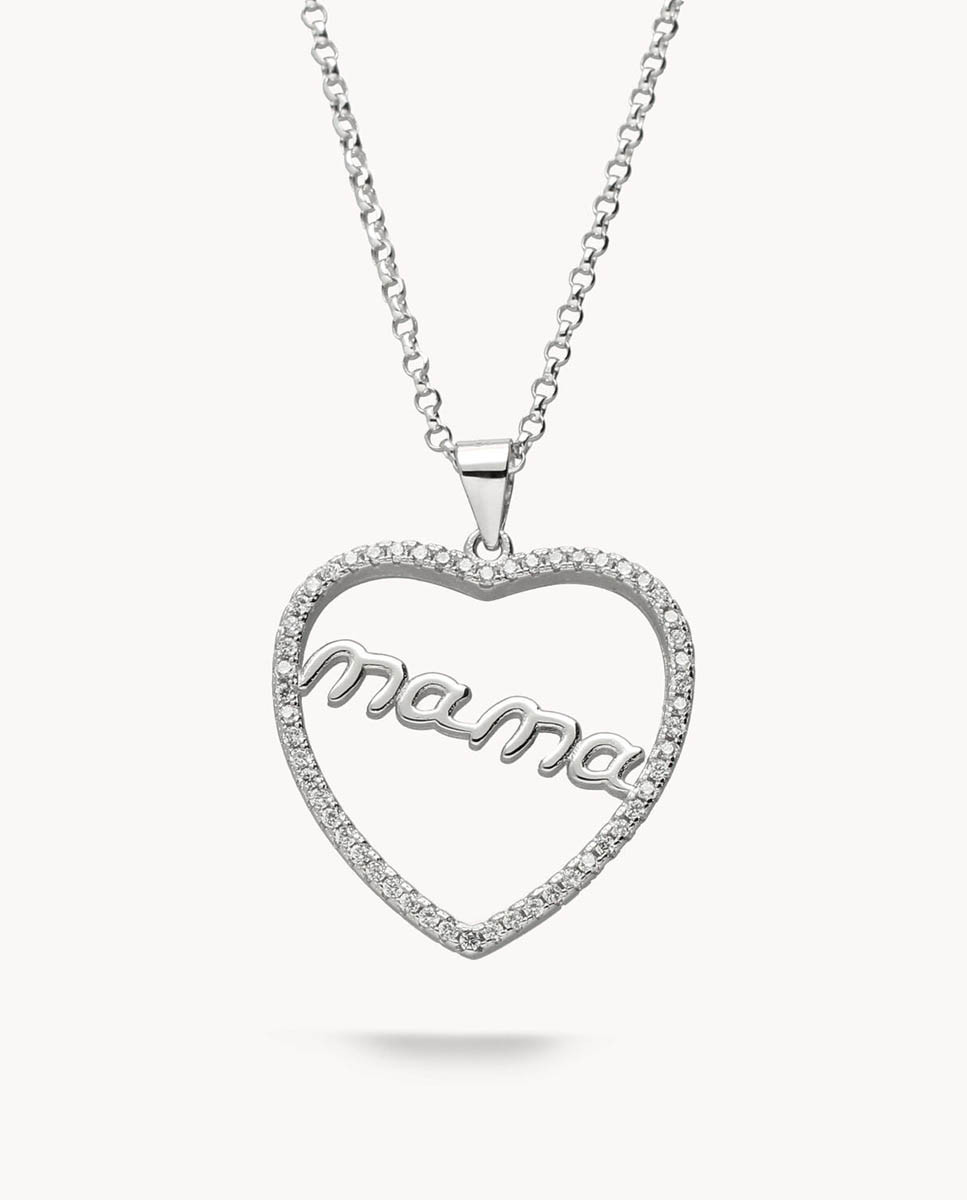 Colgante de plata de ley 925 bañada en rodio con corazón de circonitas blancas y detalle Mamá escrito en su interior, largo de 45 cms y cierre tipo reasa.