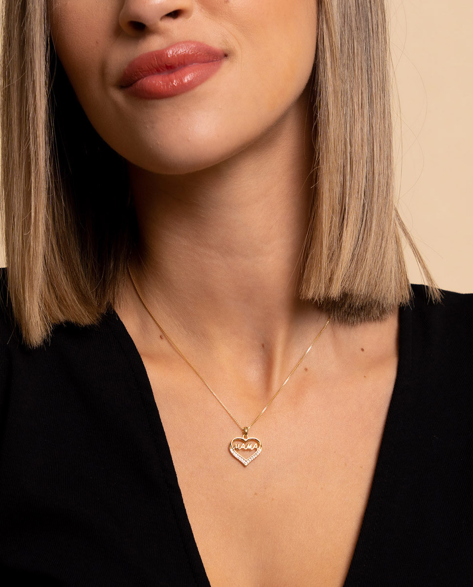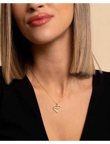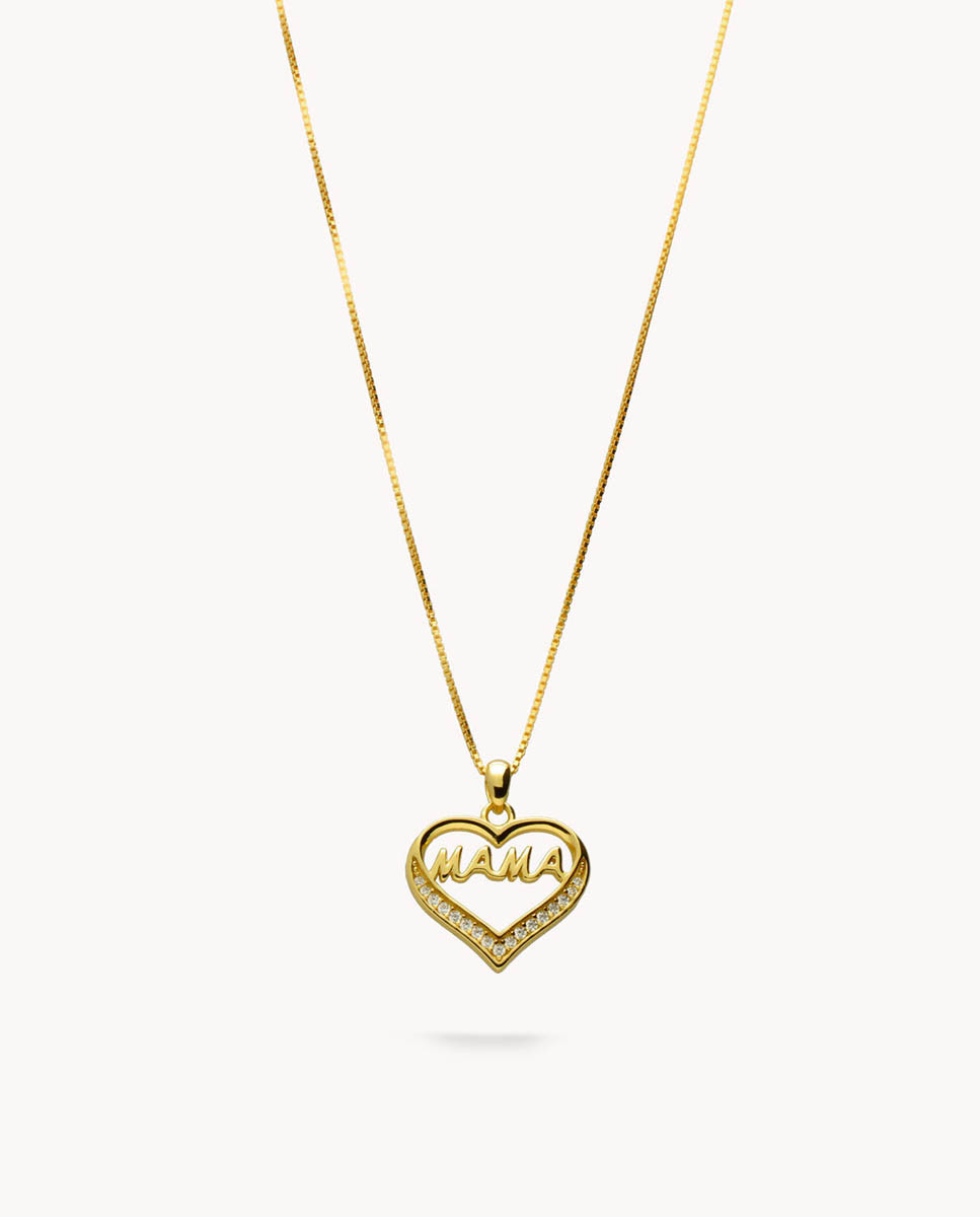 Colgante de plata de ley 925 bañada en oro de 18K con corazón de 15 mm x 15 mm (ancho x alto), Mama escrito en su interior y detalle de circonitas blancas, cadena de 45 cms de largo y cierre tipo reasa.