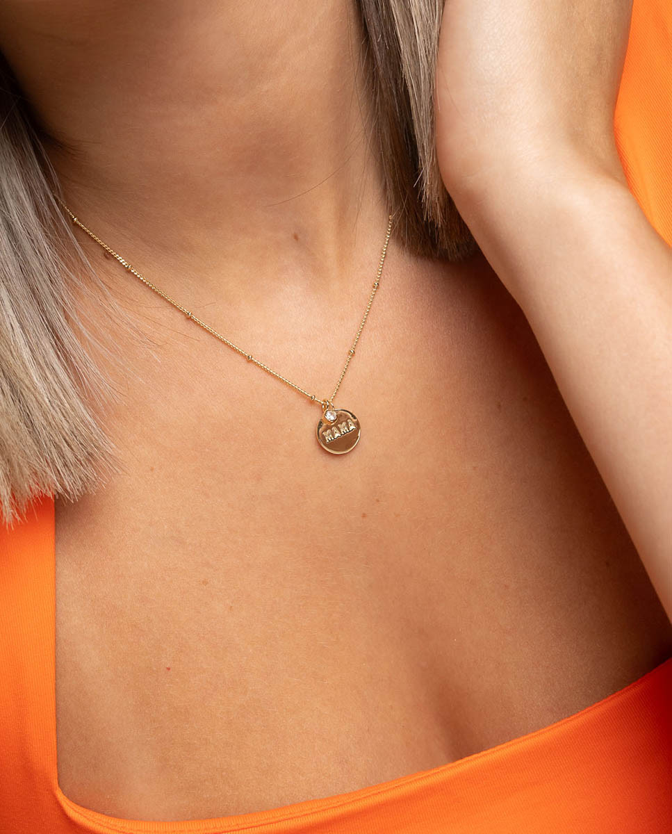 Colgante de plata de ley 925 bañada en oro 18K con chapa de 12 mm de diámetro y grabado en su interior Mamá , detalle colgante de chatón de circonita blanca de 2 mm de diámetro, largo de 40 cms más 5 cms de alargador y cierre de mosquetón.