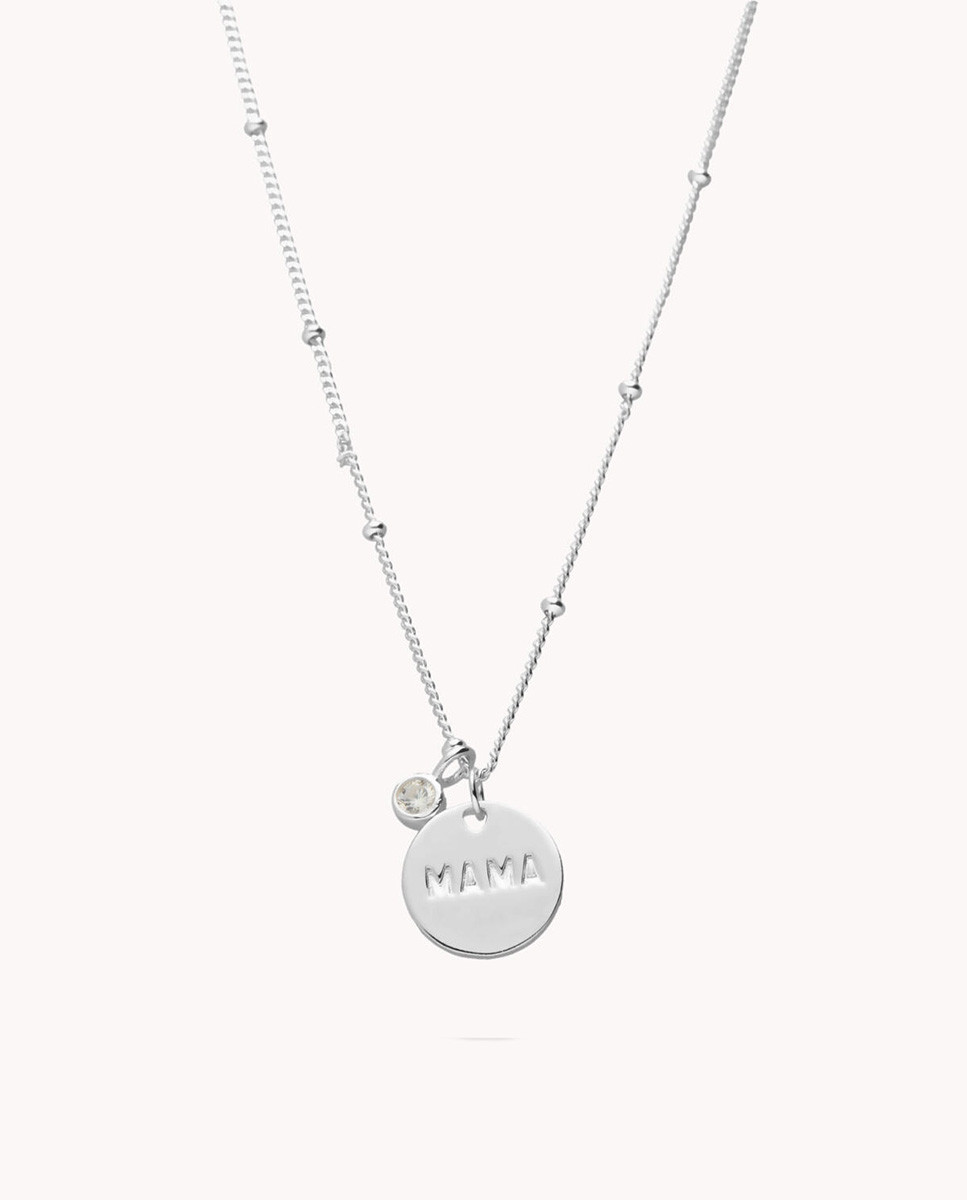 Colgante de plata de ley 925 bañada en rodio con chapa de 12 mm de diámetro y grabado en su interior Mamá , detalle colgante de chatón de circonita blanca de 3 mm de diámetro, largo de 40 cms más 5 cms de alargador y cierre de mosquetón.