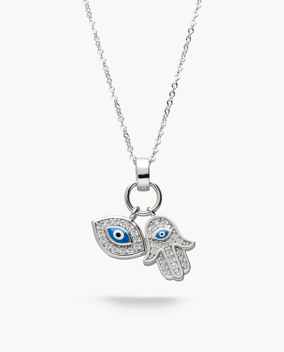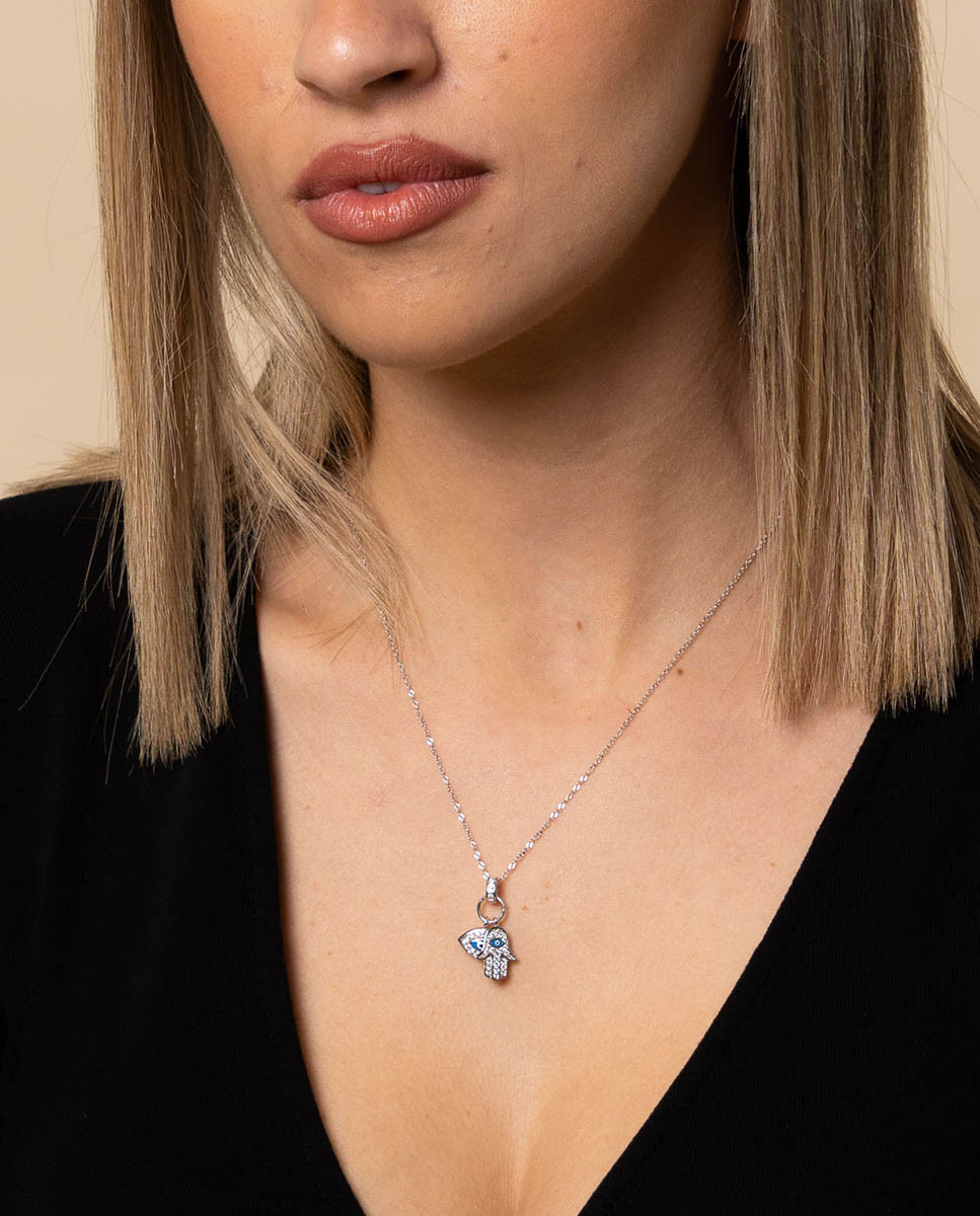 Colgante de plata de ley 925 bañada en rodio con mano de Fátima y ojo turco esmaltados y con circonitas blancas. Cadena de 45 cms de largo con cierre tipo mosquetón.