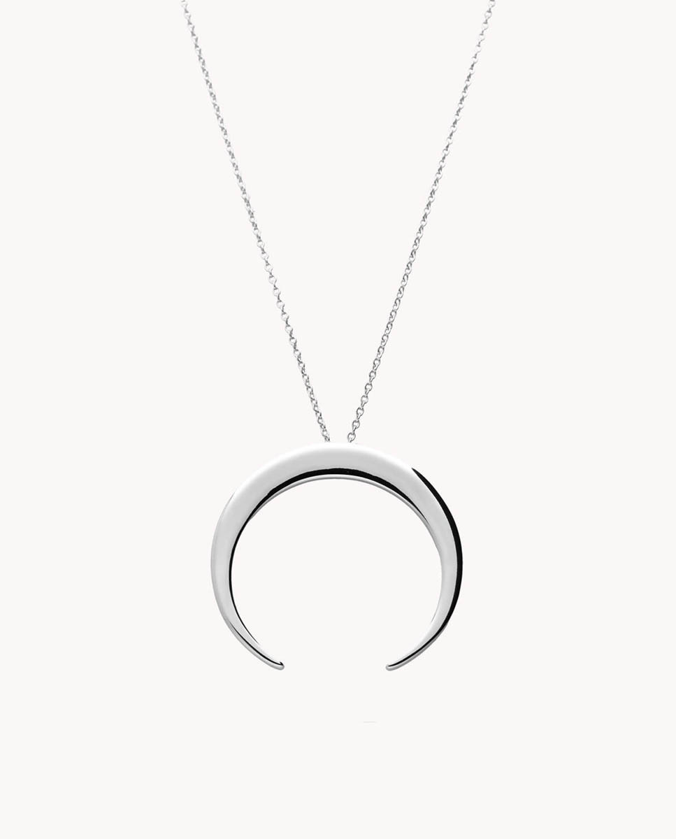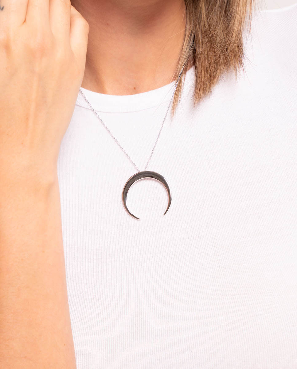 Colgante de plata de ley 925 bañada en rodio con forma de media luna de 36 mm x 35 mm (ancho por alto), largo de 40 cms más 5 cms de alargador y cierre de mosquetón.