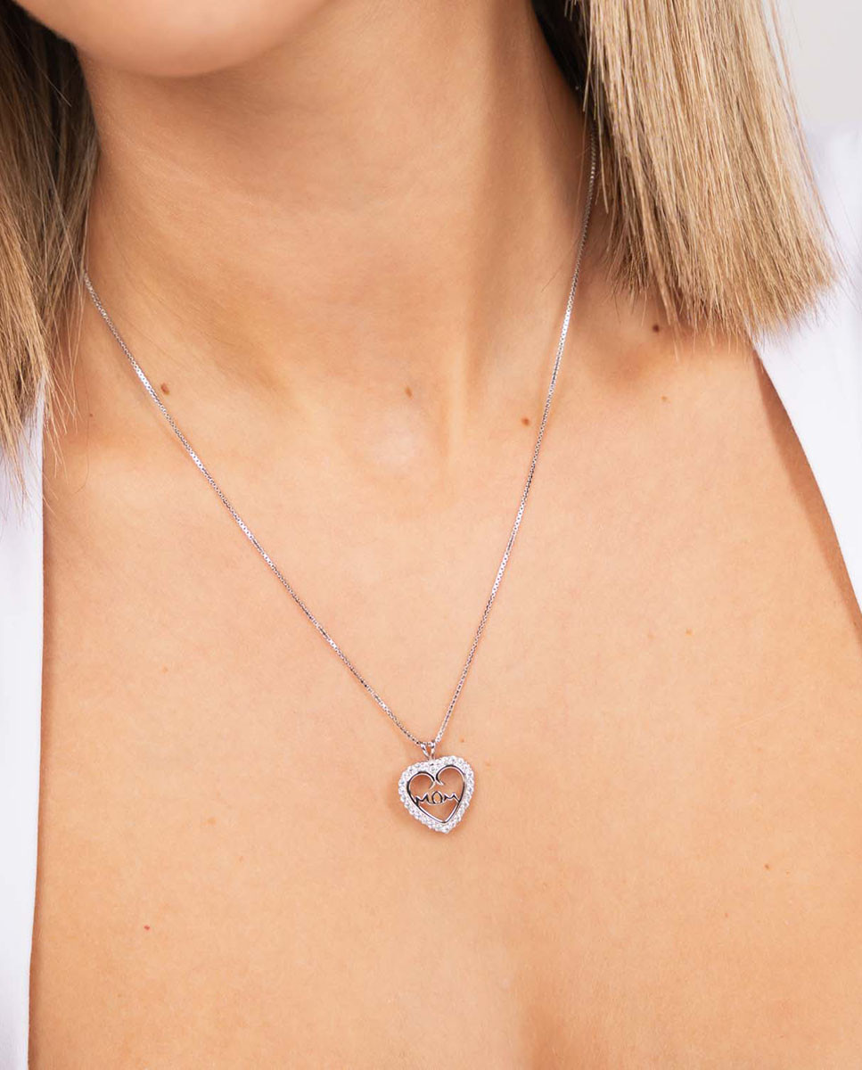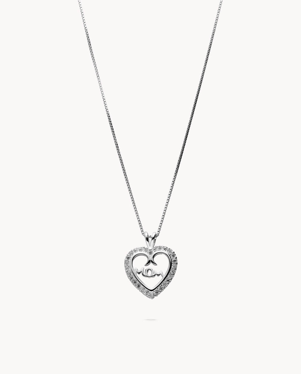 Colgante de plata de ley 925 bañada en rodio con corazón de circonitas blancas y motivo Mom escrito en su interior, largo de 40 cms más 5 cms de alargador y cierre tipo reasa.