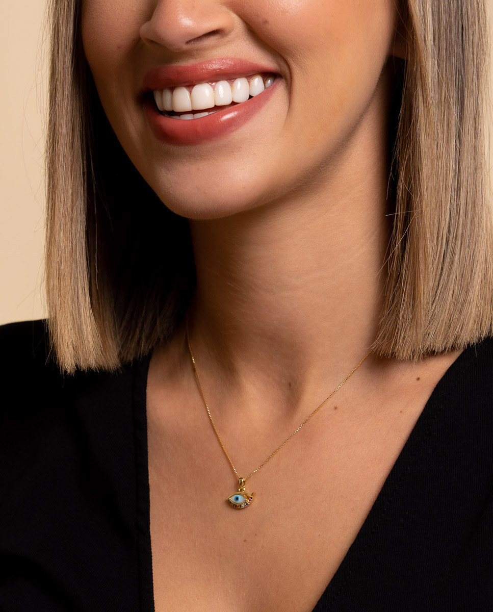 Colgante de plata de ley 925 bañada en oro 18K con ojo turco nacarado de 14 mm x 7 mm (ancho por alto), combinado con circonitas multicolor. Cadena de 40 cms más 5 cms de alargador con cierre tipo reasa.