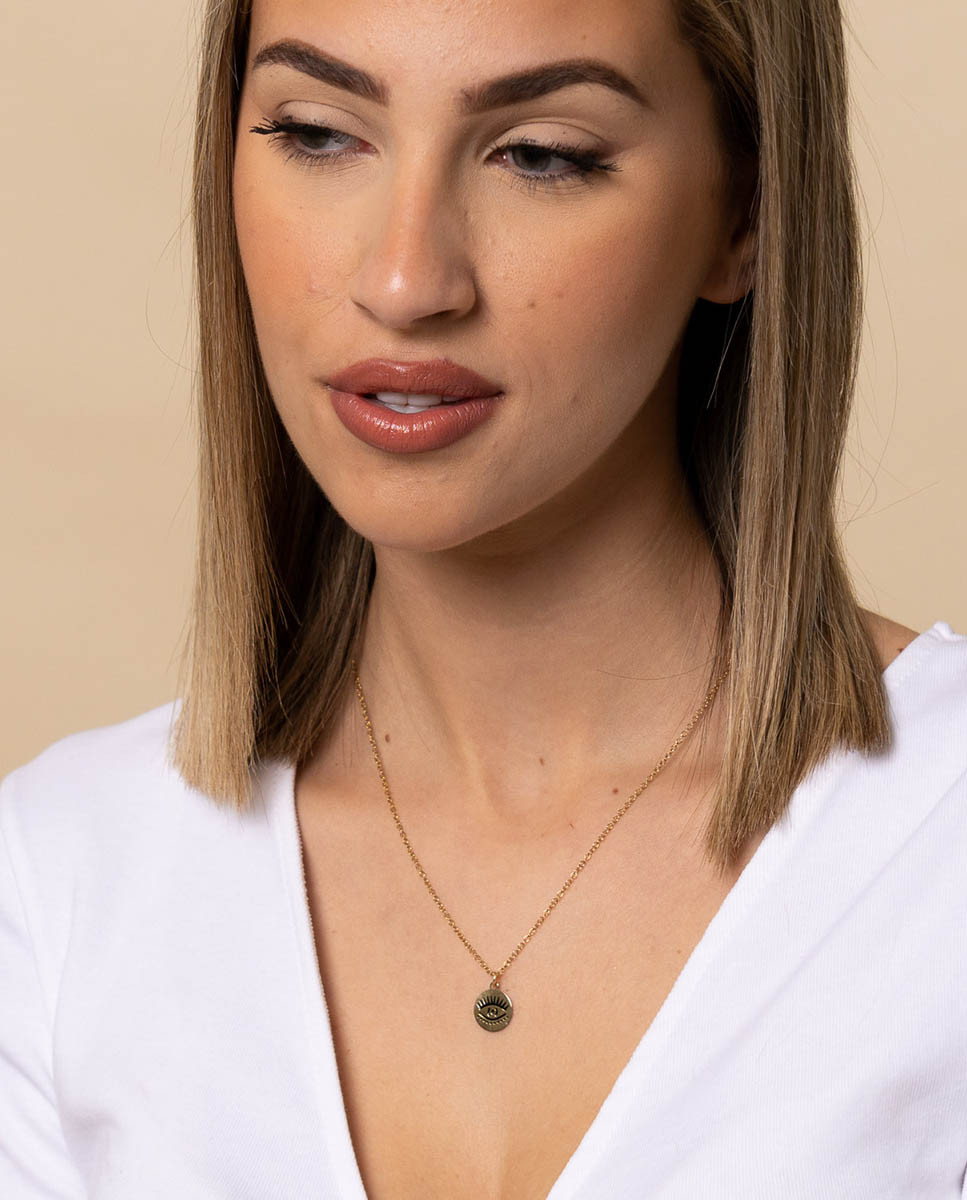 Colgante de plata de ley 925 bañada en oro con chapa y ojo turco en su interior. Cadena de 40 cms de largo más 5 cms de alargador y cierre de mosquetón.