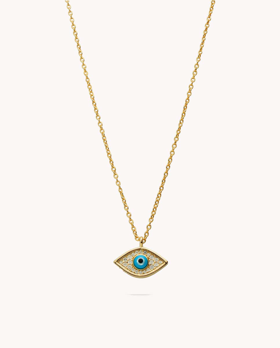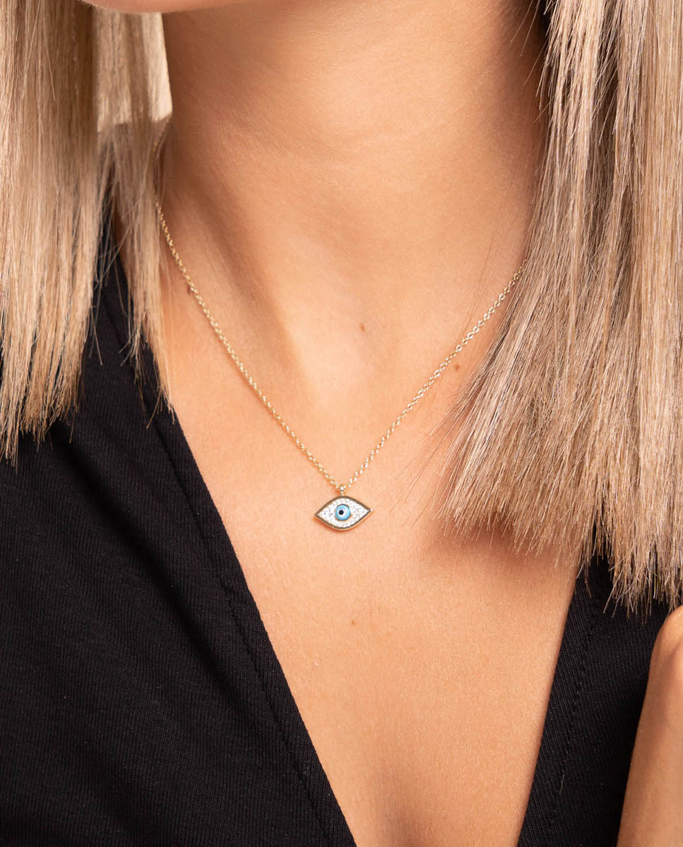 Colgante de plata de ley 925 bañada en oro con motivo de ojo turco de 15 mm x 8 mm (ancho por alto) con circonitas blancas, largo de 40 cms más 5 cms de alargador y cierre de mosquetón.