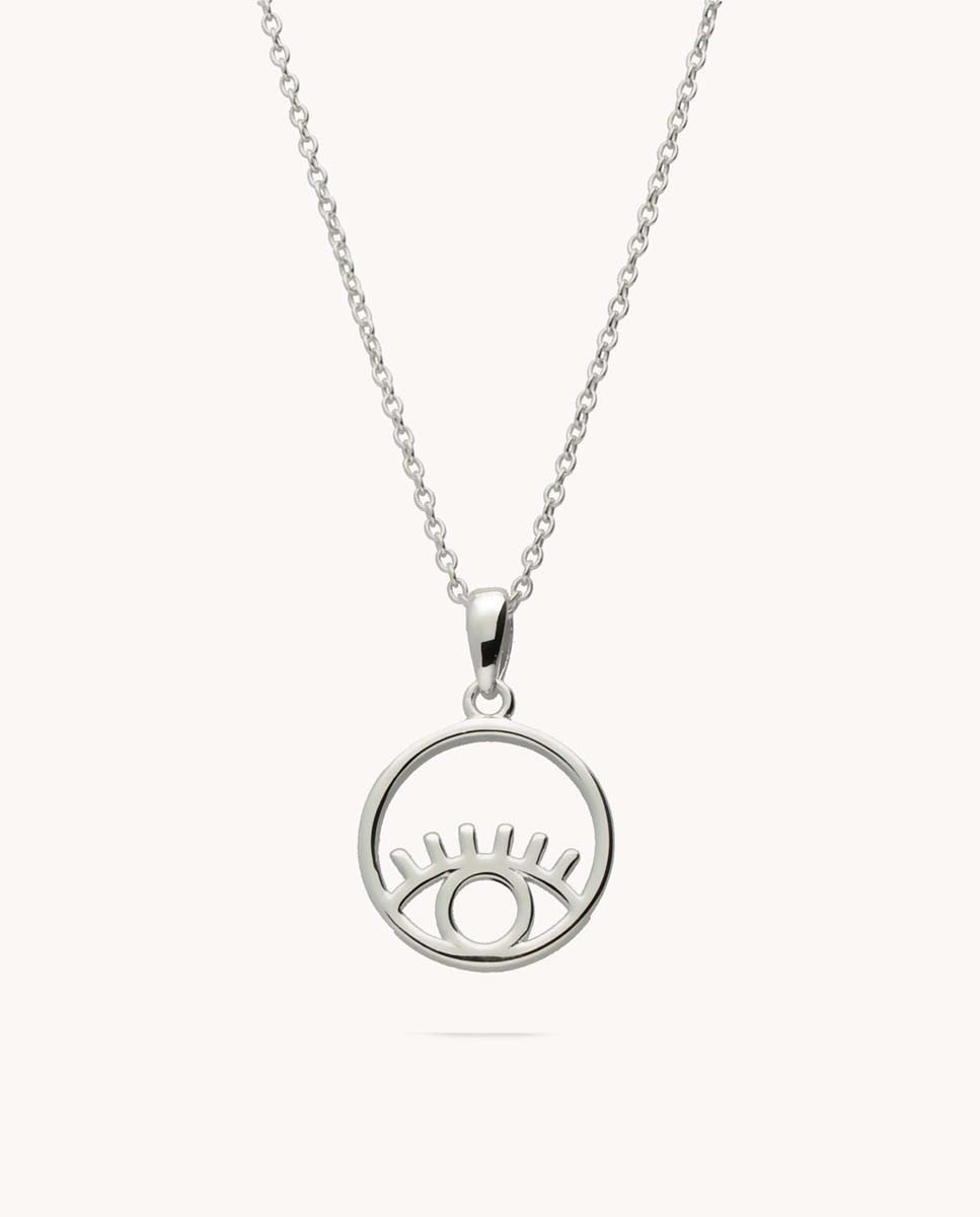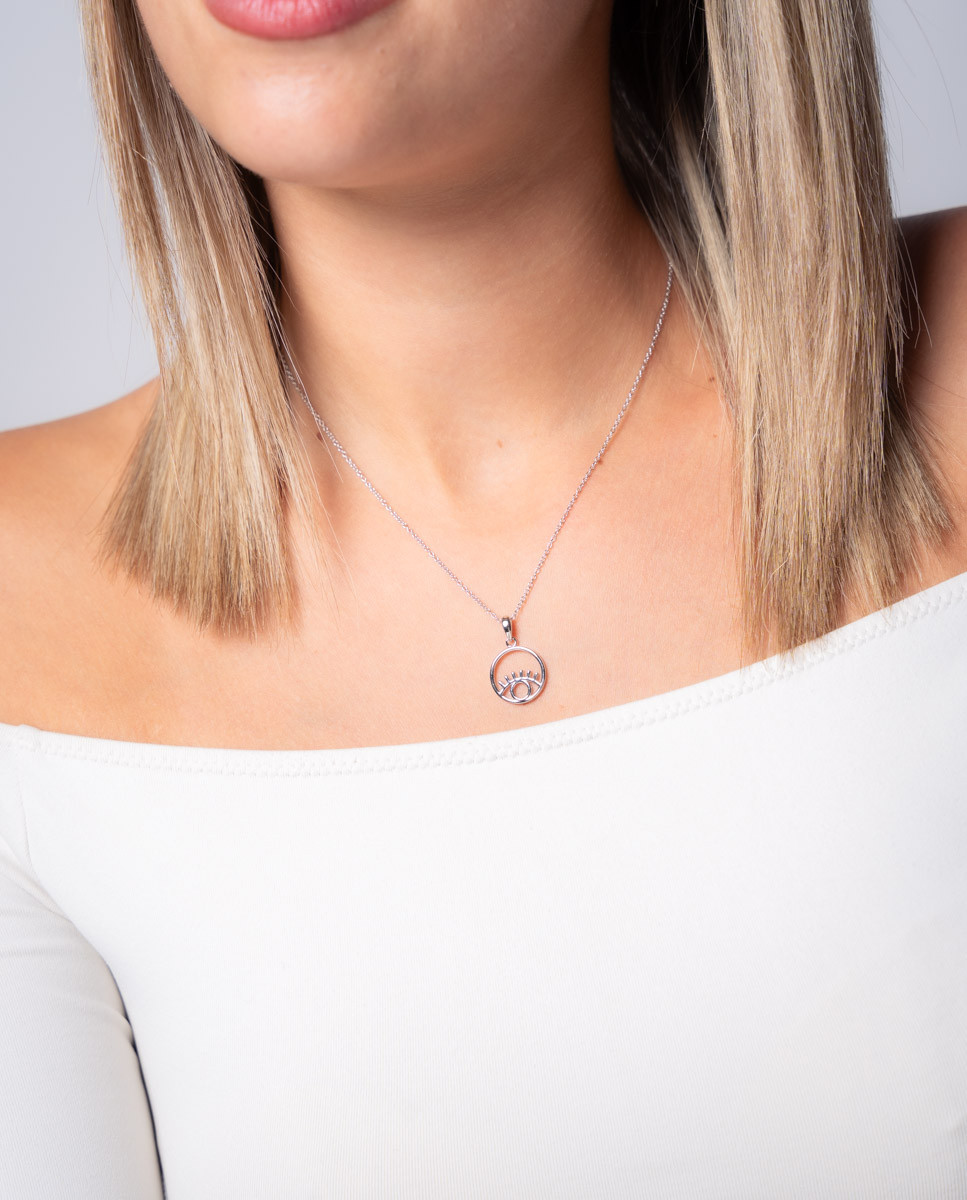 Colgante de plata de ley 925 bañada en rodio con ojo turco de 14 mm de diámetro, cadena de 40 cms más 5 cms de alargador y cierre de mosquetón.