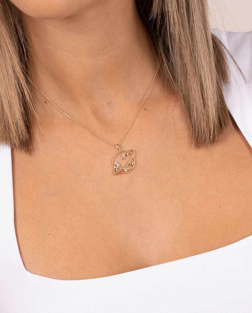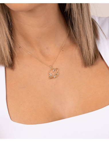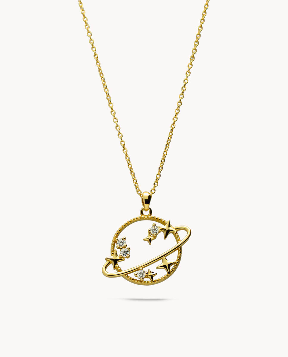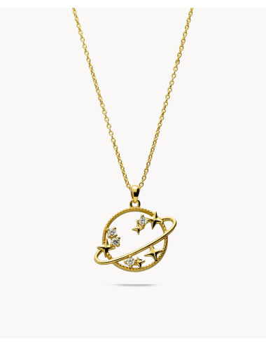 Colgante de plata de ley 925 bañada en oro 18K en forma de planeta con circonitas blancas de 18 mm de diámetro, largo de 40,5 cms más 5 cms de alargador y cierre de mosquetón.