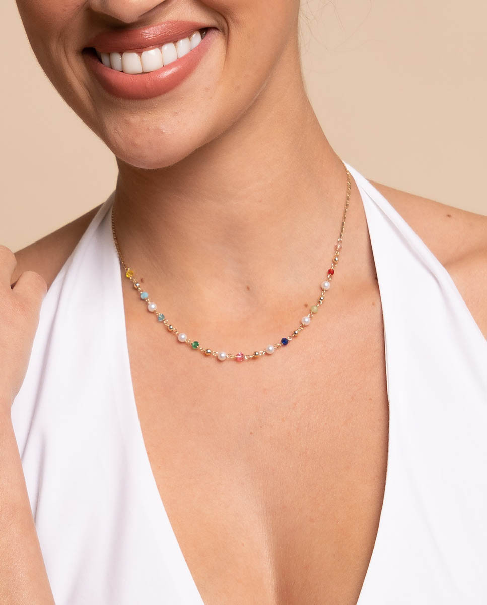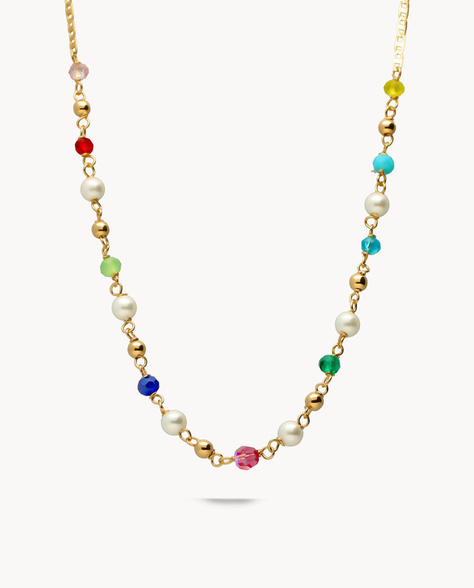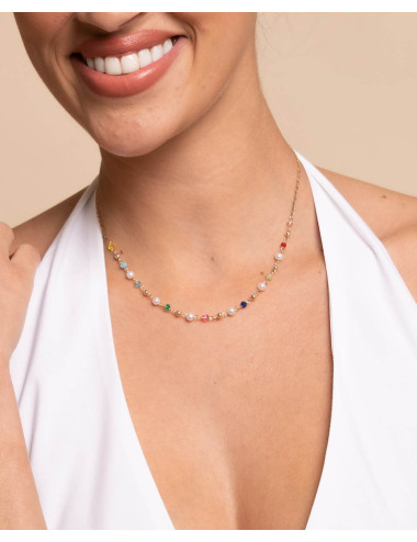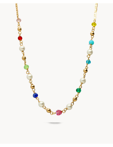 Collar de plata de ley 925 bañada en oro 18k con perlas cultivadas de 4 mm de diámetro (aproximadamente) y piedras multicolor, largo de 38,5 cms más 4 cms de alargador y cierre tipo reasa.