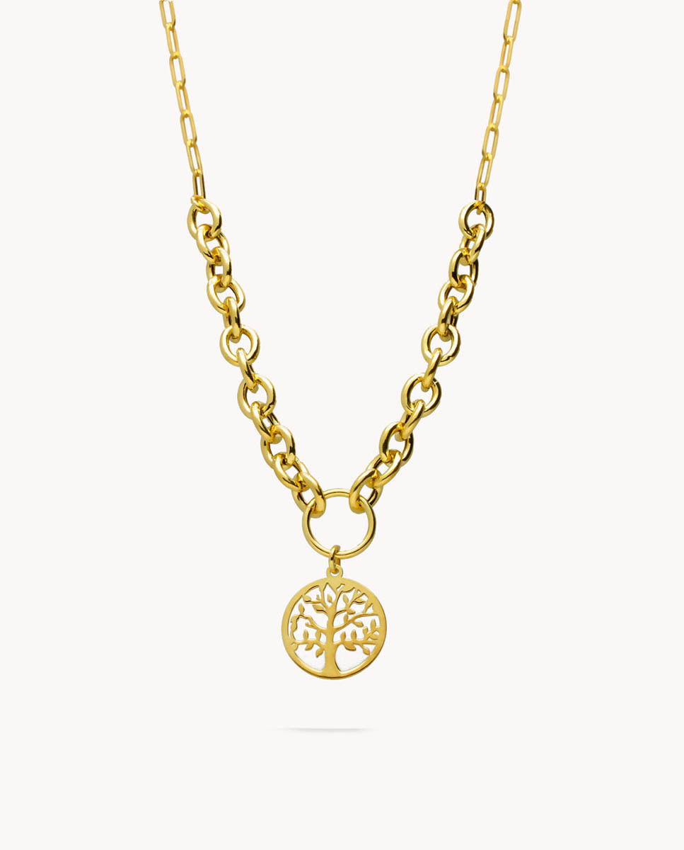 Collar de plata de ley 925 bañada en oro combinando dos tipos de eslabones y colgante central de árbol de la vida de 15 mm de diámetro, largo de 40 cms más 5 cms de alargador y cierre de mosquetón.