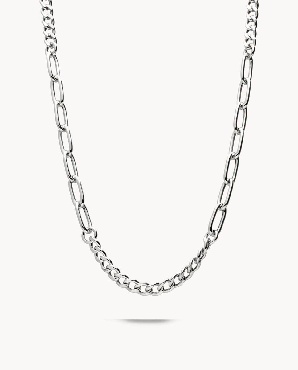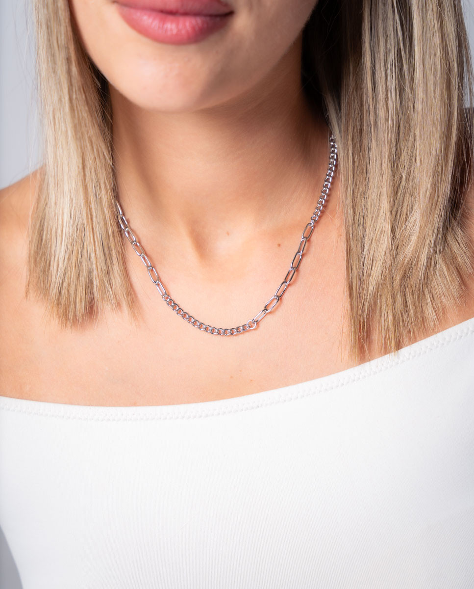 Collar de plata de ley 925 bañado en rodio combinando eslabones tipo barbado y forzado, largo de 41 cms más 5 cms de alargador y cierre de mosquetón.