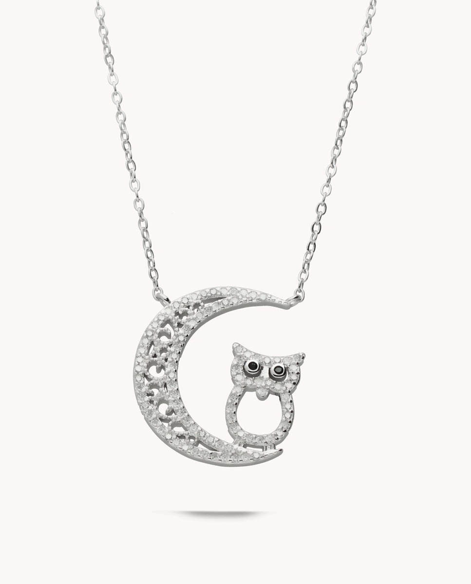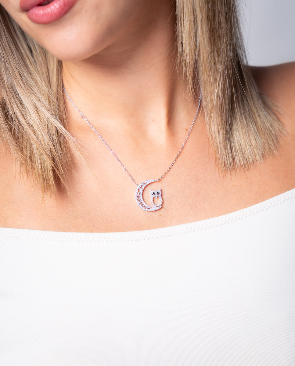 Collar búho en luna suerte de plata de ley 925 bañada en rodio