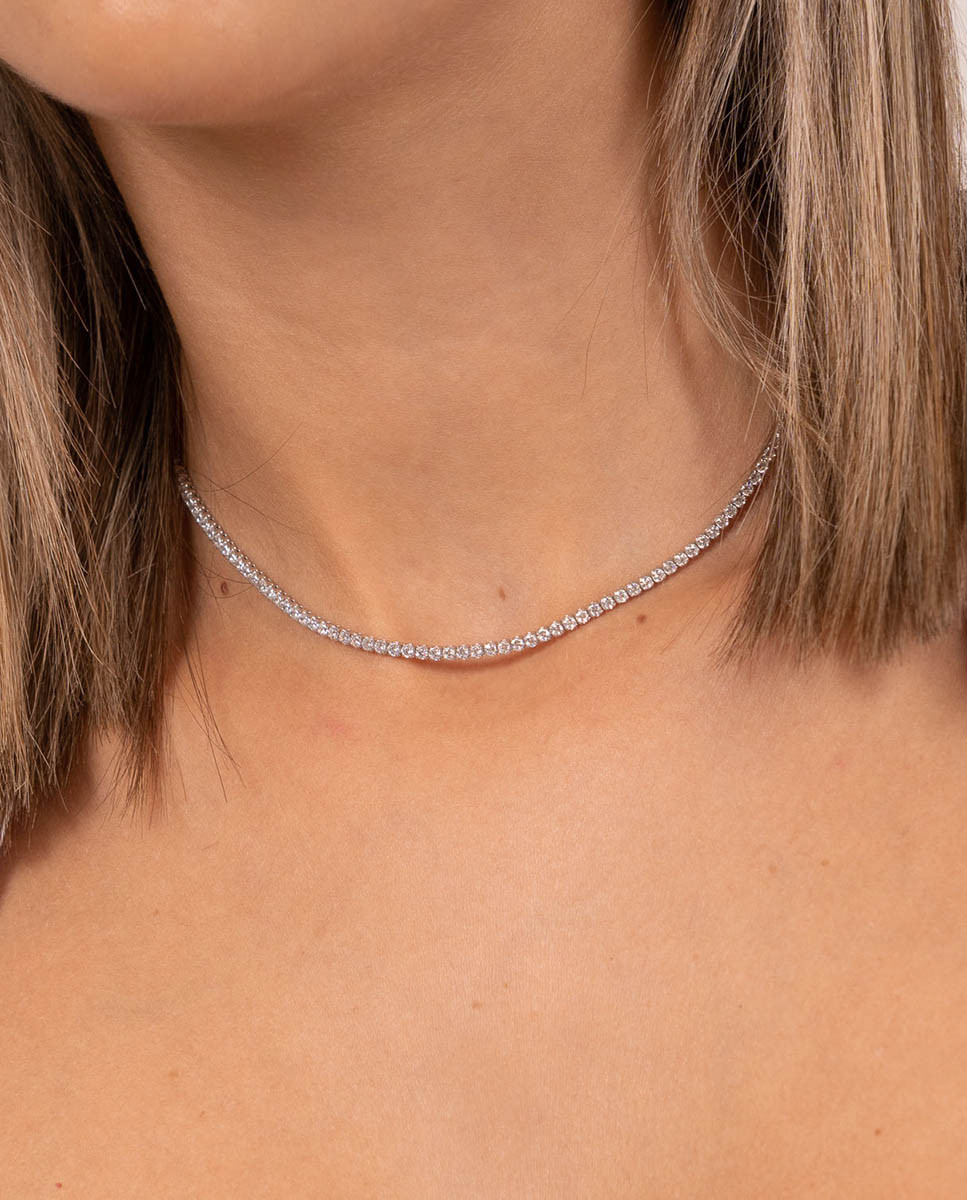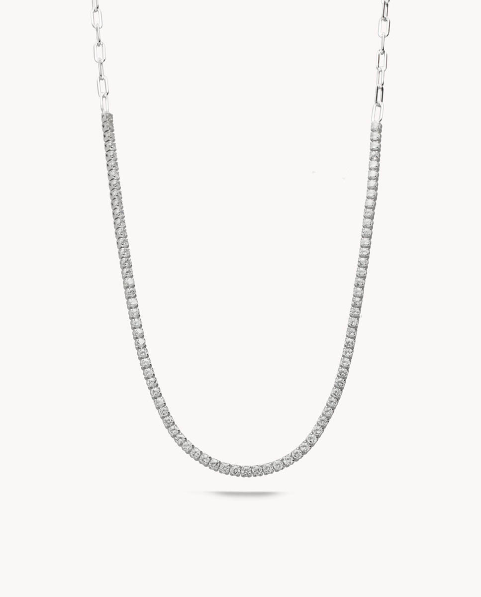 Collar de plata de ley 925 bañada en rodio con tira de circonitas blancas de 2 mm de diámetro y 18 cms de largo en la parte central combinadas con cadena de eslabón, cierre de mosquetón y largo de 37 cms más 8 cms de alargador.