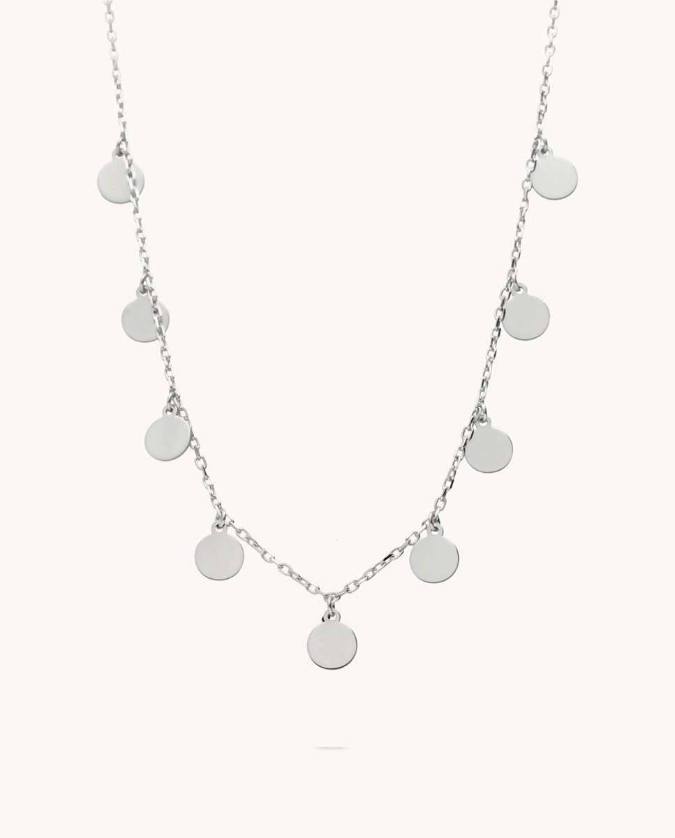 Collar de plata de ley 925 bañada en rodio con colgantes de chapas de 6 mm de diámetro, cierre de mosquetón y largo de 41 cms más 4 cms de alargador.