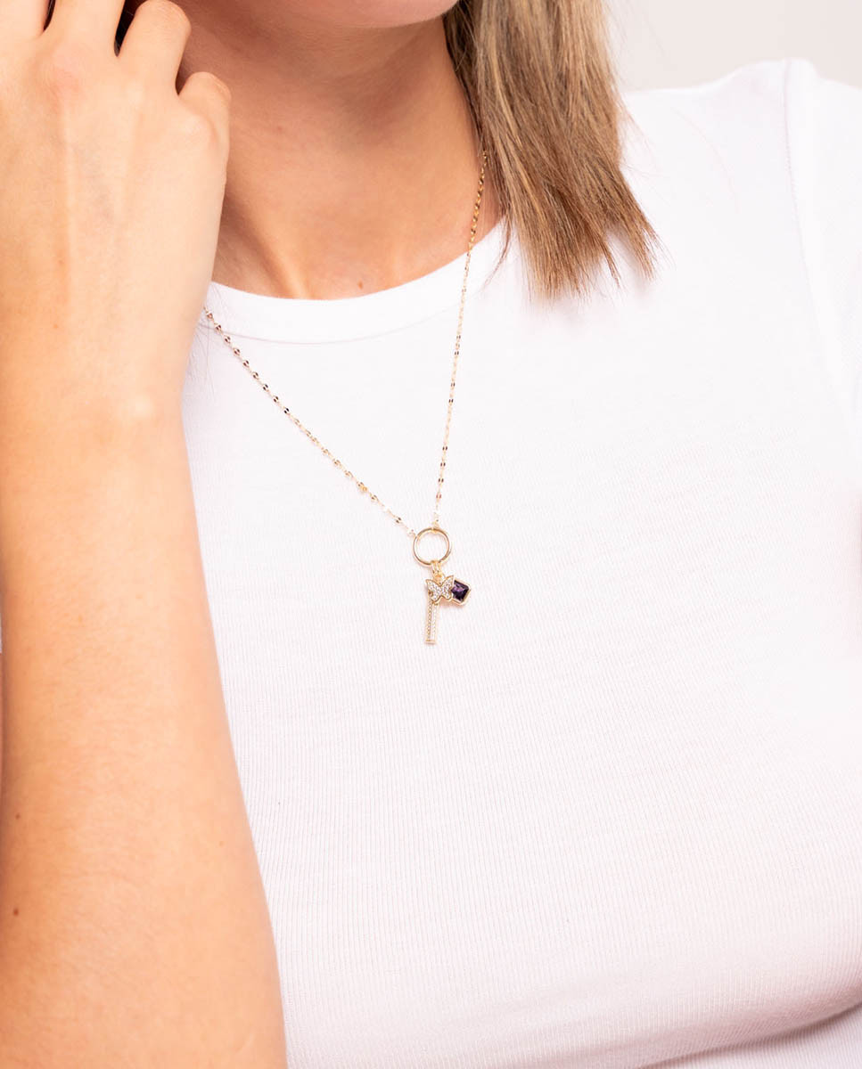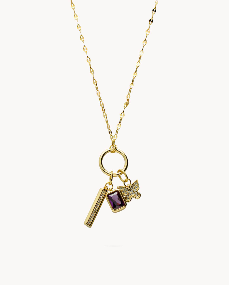 Collar de plata de ley 925 bañada en oro 18k con mariposa de 9 mm x 8 mm (ancho por alto) y circonitas blancas en su interior, circonita amatista de 5 mm x 7 mm (ancho por alto) y barra de circonitas blancas de 3 mm x 16 mm (ancho por alto), largo a tres alturas (40 - 45 y 50 cms) y cierre de mosquetón.
