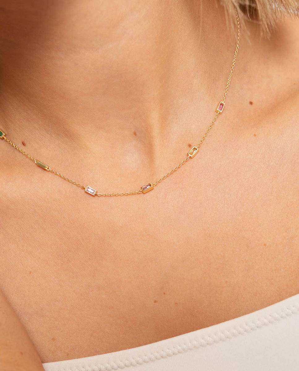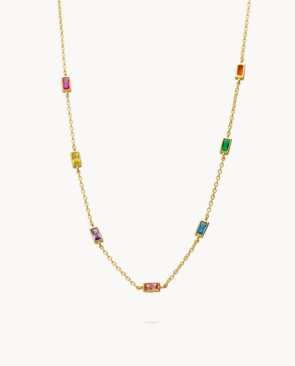 Collar de plata de ley 925 bañada en oro 18K con circonitas multicolor intercaladas de 4 mm x 2 mm (largo por ancho), cierre de mosquetón y largo de 40 cms más 5 cms de alargador.