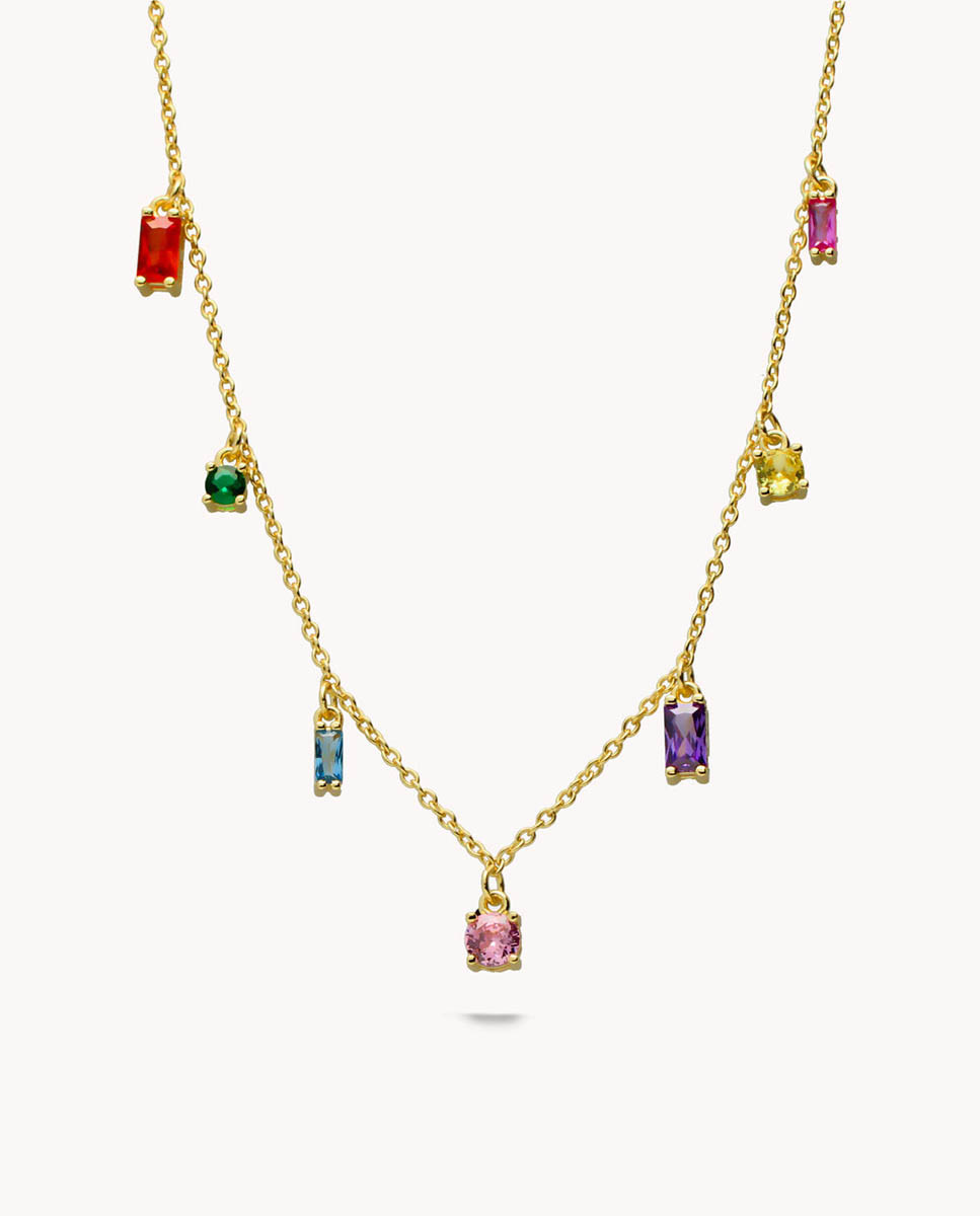 Collar de plata de ley 925 bañada en oro 18K con colgantes de circonitas multicolor, largo de 40 cms más 5,5 cms de alargador y cierre de mosquetón.