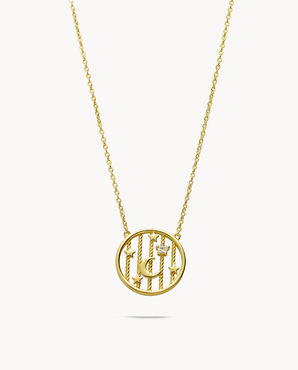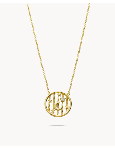 Collar de plata de ley 925 bañada en oro 18K con forma de constelación de 18 mm de diámetro y circonita blanca en su interior, largo de 40 cms más 5 cms de alargador y cierre de mosquetón.