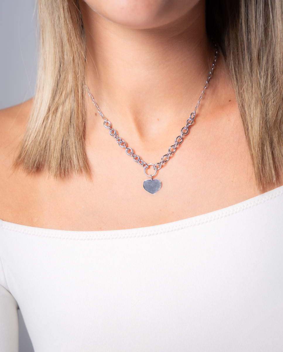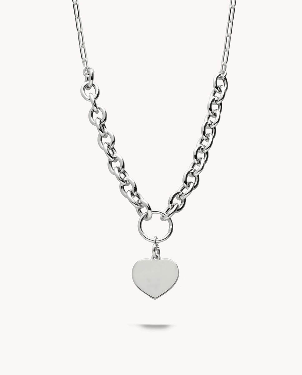 Collar de plata de ley 925 bañada en rodio combinando dos tipos de eslabones y colgante central de corazón de 15 mm x 12 mm (ancho por alto), largo de 39 cms más 5 cms de alargador y cierre de mosquetón.