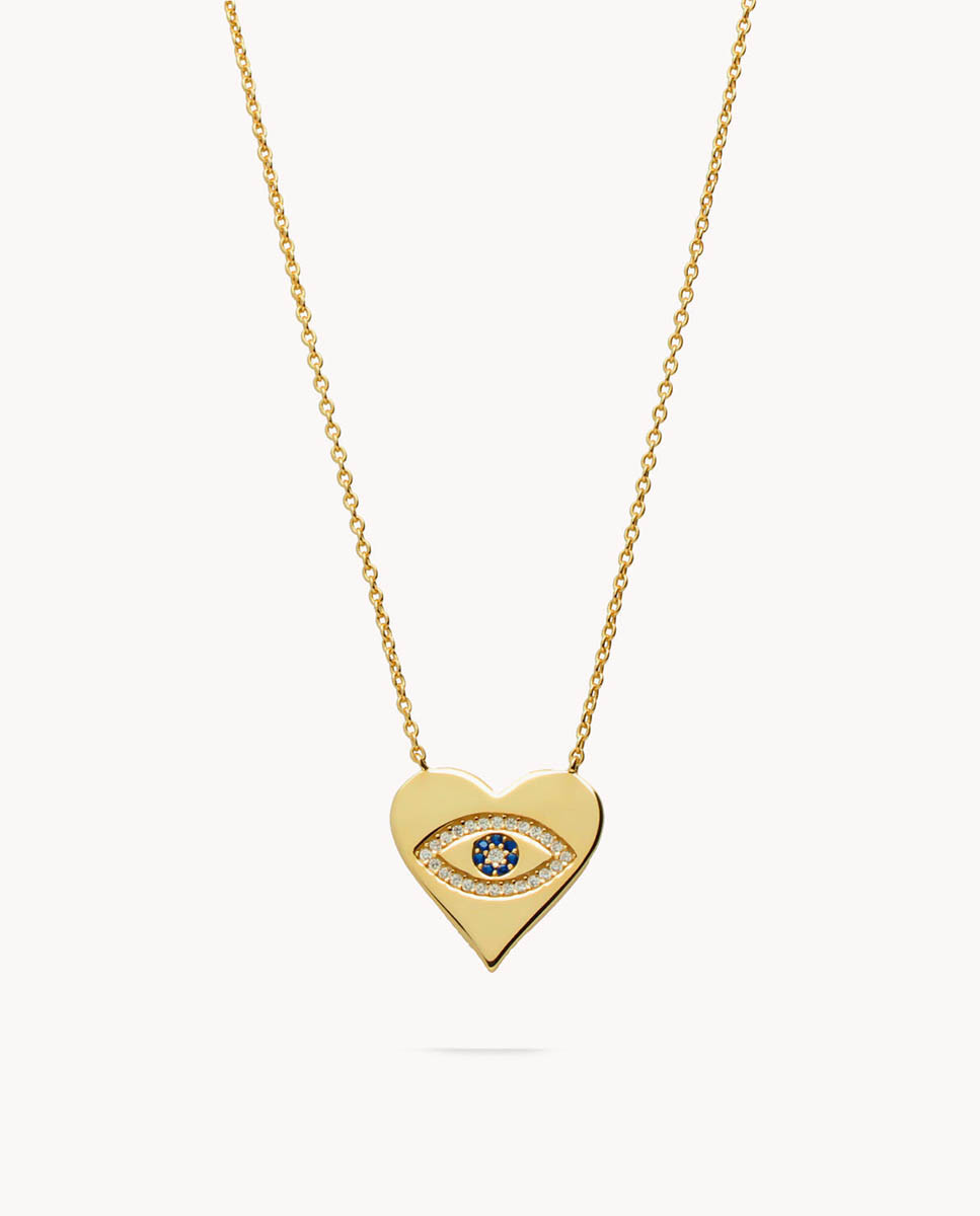 Collar de plata de ley 925 bañada en oro con motivo central de corazón de 17 mm x 17 mm (ancho por alto) y en el centro ojo turco con circonitas blancas y azules, largo de 41 cms más 5 cms de alargador y cierre de mosquetón.