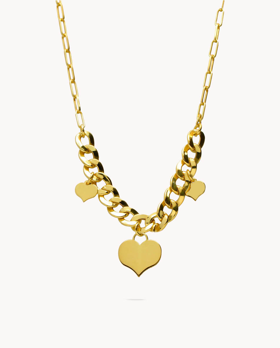 Collar de plata de ley 925 bañada en oro con eslabón central barbado y colgantes de corazones, largo de 40 cms más 5 cms de alargador.