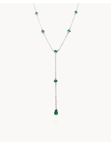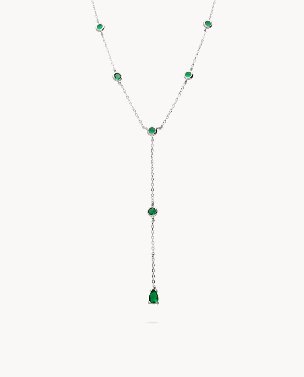 Collar de plata de ley 925 bañada en rodio tipo corbata con circonitas de chatón de 3 mm de diámetro y circonita en forma de lágrima color esmeralda de 4 mm x 5 mm (ancho por alto), largo de 40 cms más 5 cms de alargador y cierre de mosquetón.