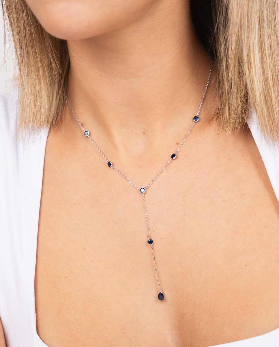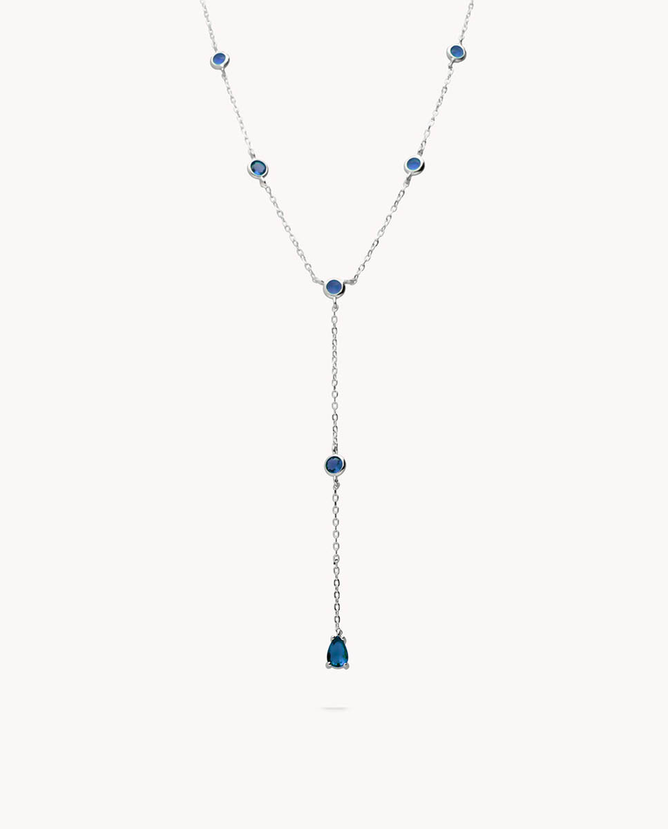Collar de plata de ley 925 bañada en rodio tipo corbata con circonitas de chatón de 3 mm de diámetro y circonita en forma de lagrima color zafiro de 4 mm x 5 mm (ancho por alto), largo de 40 cms más 5 cms de alargador y cierre de mosquetón.