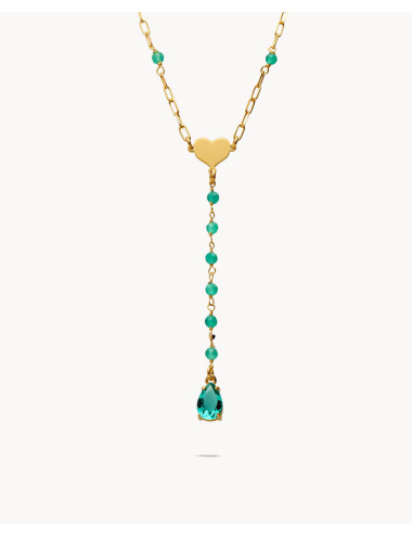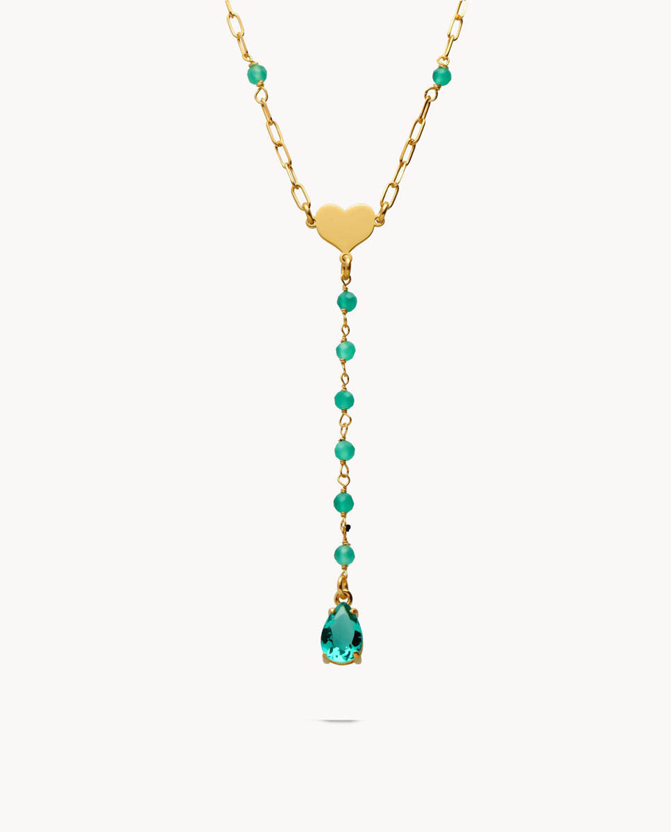 Collar de plata de ley 925 bañada en oro 18K con cristales de Swarovski de 3 mm de diámetro incorporados en la cadena y corazón central de 9 mm x 8 mm (ancho por alto), caída de 5 cms finalizando con circonita color aguamarina en forma de gota de 6 mm x 9 mm (ancho por alto).