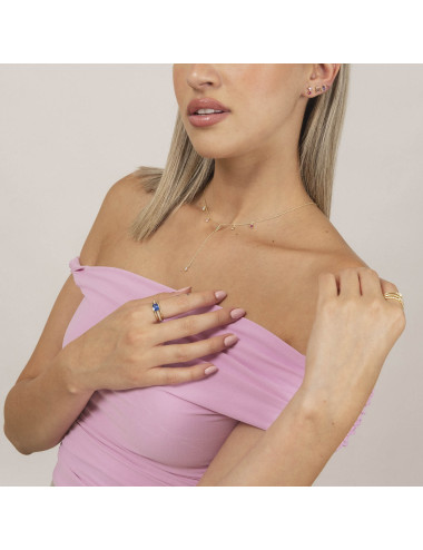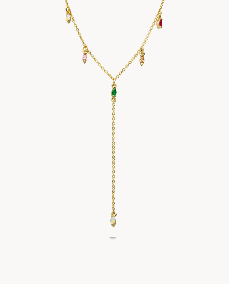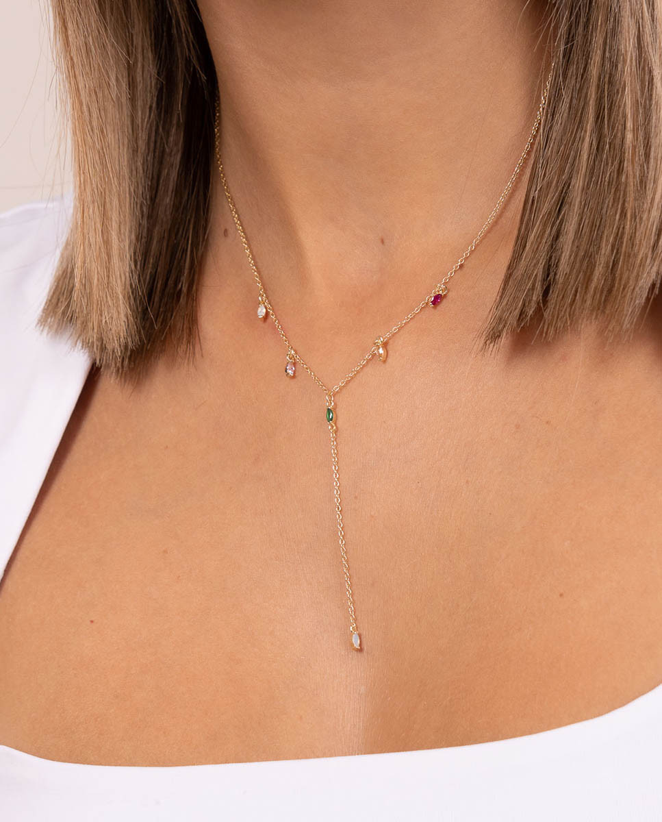 Collar de plata de ley 925 bañada en oro 18K con colgantes de circonitas multicolor, largo de 40 cms más 5,5 cms de alargador y cierre de mosquetón.