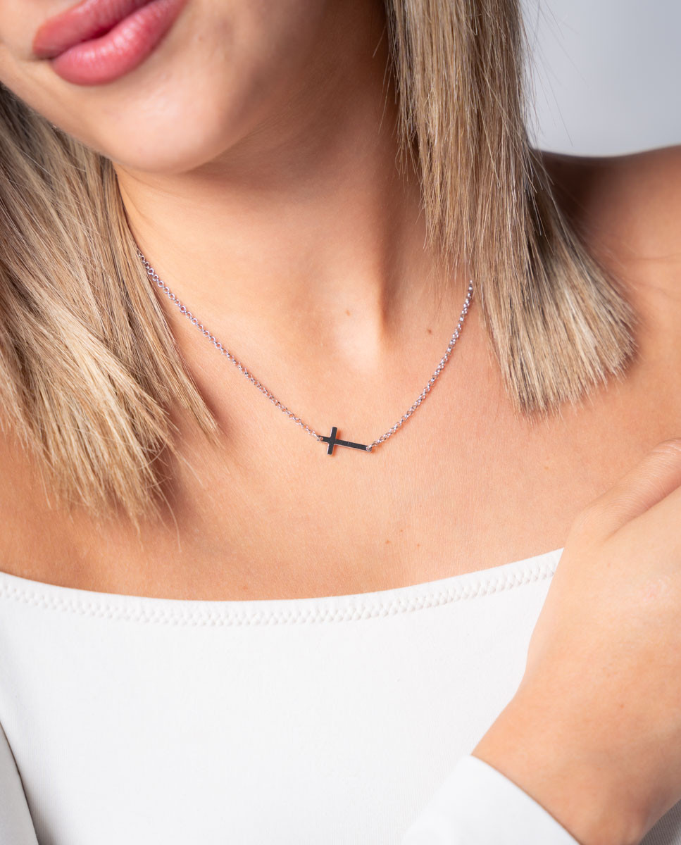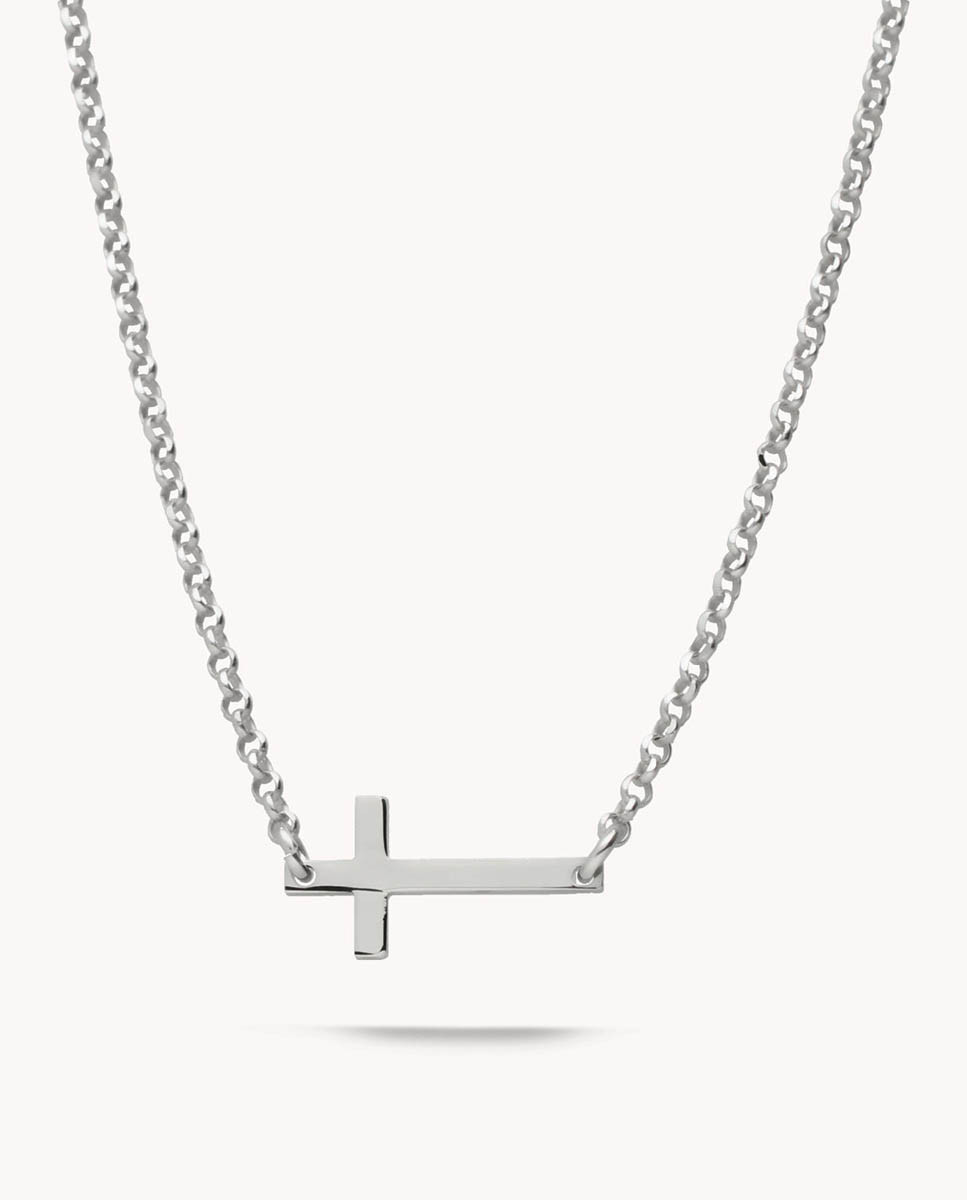 Collar de plata de ley 925 bañada en rodio con motivo de cruz central de 9 mm x 17 mm (ancho por alto), cierre de mosquetón y largo de 41,5 cms más 3 cms de alargador.