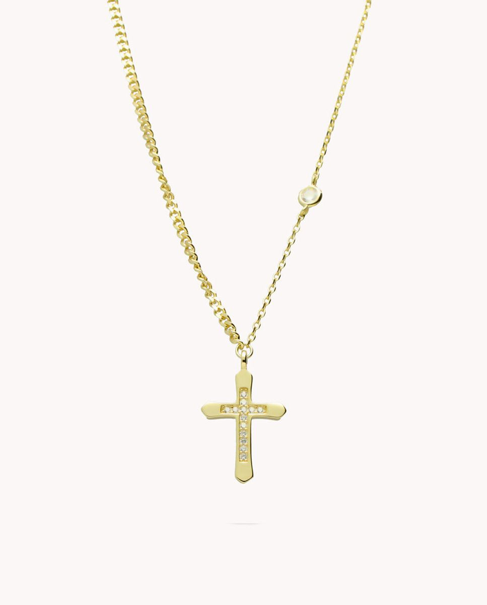 Collar de plata de ley 925 bañada en oro con cadena combinada y colgante de cruz con circonitas blancas, detalle lateral de chatón con circonita blanca de 4 mm de diámetro.