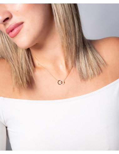 Collar de plata de ley 925 bañada en oro con colgante de doble karma entrelazados combinado con circonitas blancas de 15 mm x 10 mm (ancho por alto), cierre tipo reasa y largo de 40,5 cms más 5 cms de alargador.