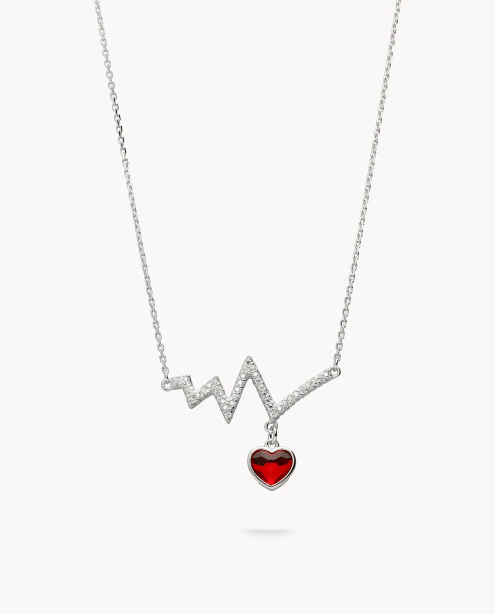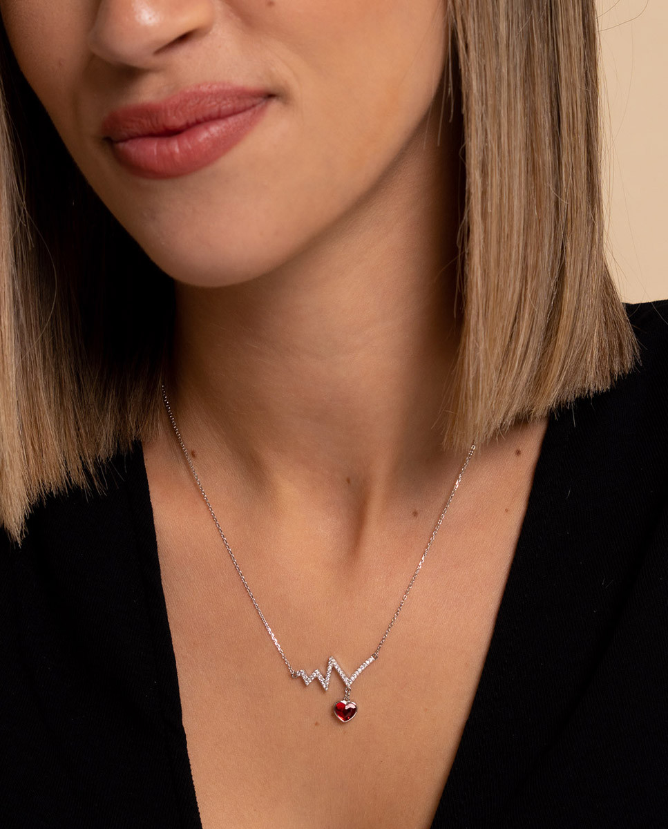 Collar de plata de ley 925 bañada en rodio con electrocardiograma con circonitas balncas de 25 mm x 10 mm (ancho por alto) y colgante de corazón con circonita roja de 6 mm x 6 mm (ancho por alto). Cadena de 42,5 cms de largo más 5,5 cms de alargador y cierre tipo reasa.