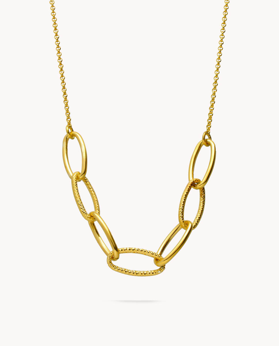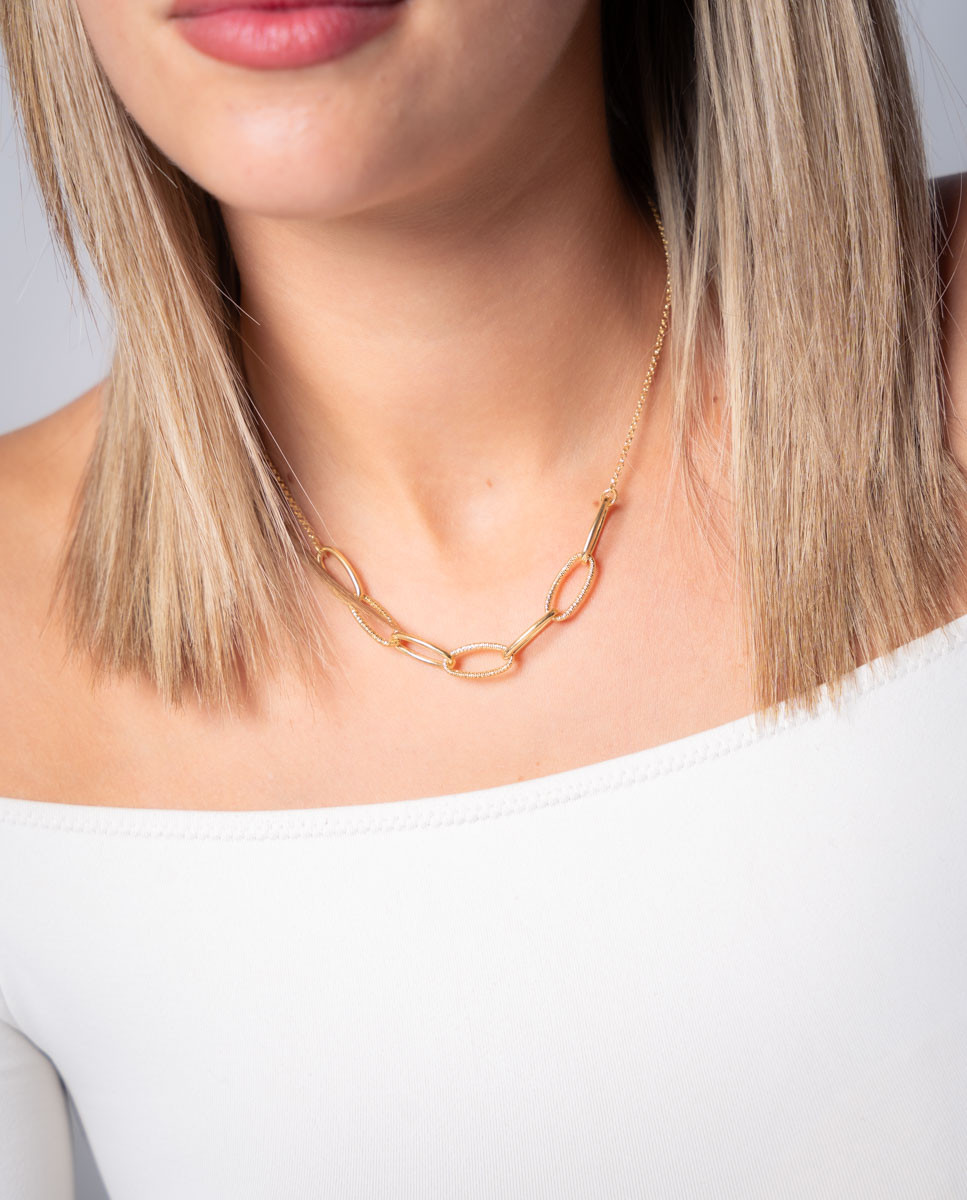 Collar de plata de ley 925 bañada en oro con eslabones centrales, largo de 40 cms más 5 cms de alargador y cierre de mosquetón.