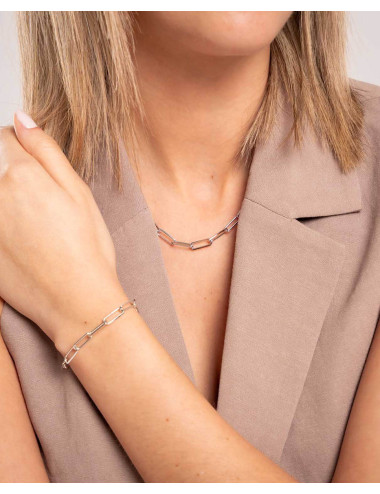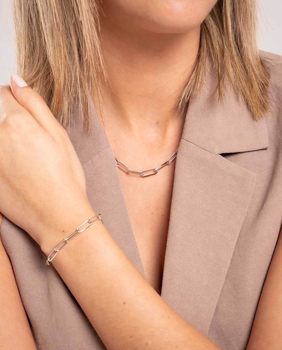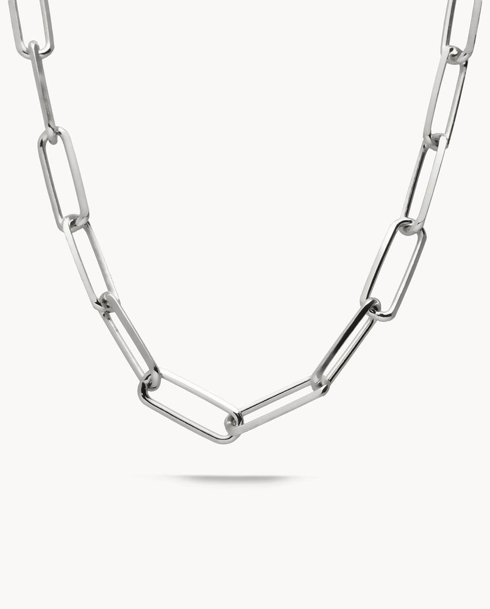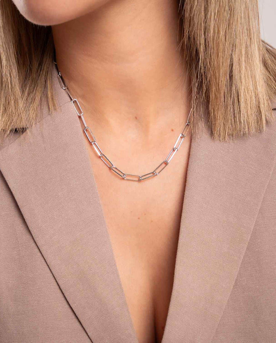 Collar de plata de ley 925 bañada en rodio con eslabones tipo forzado, largo de 40 cms más 5 cms de alargador y cierre de mosquetón.