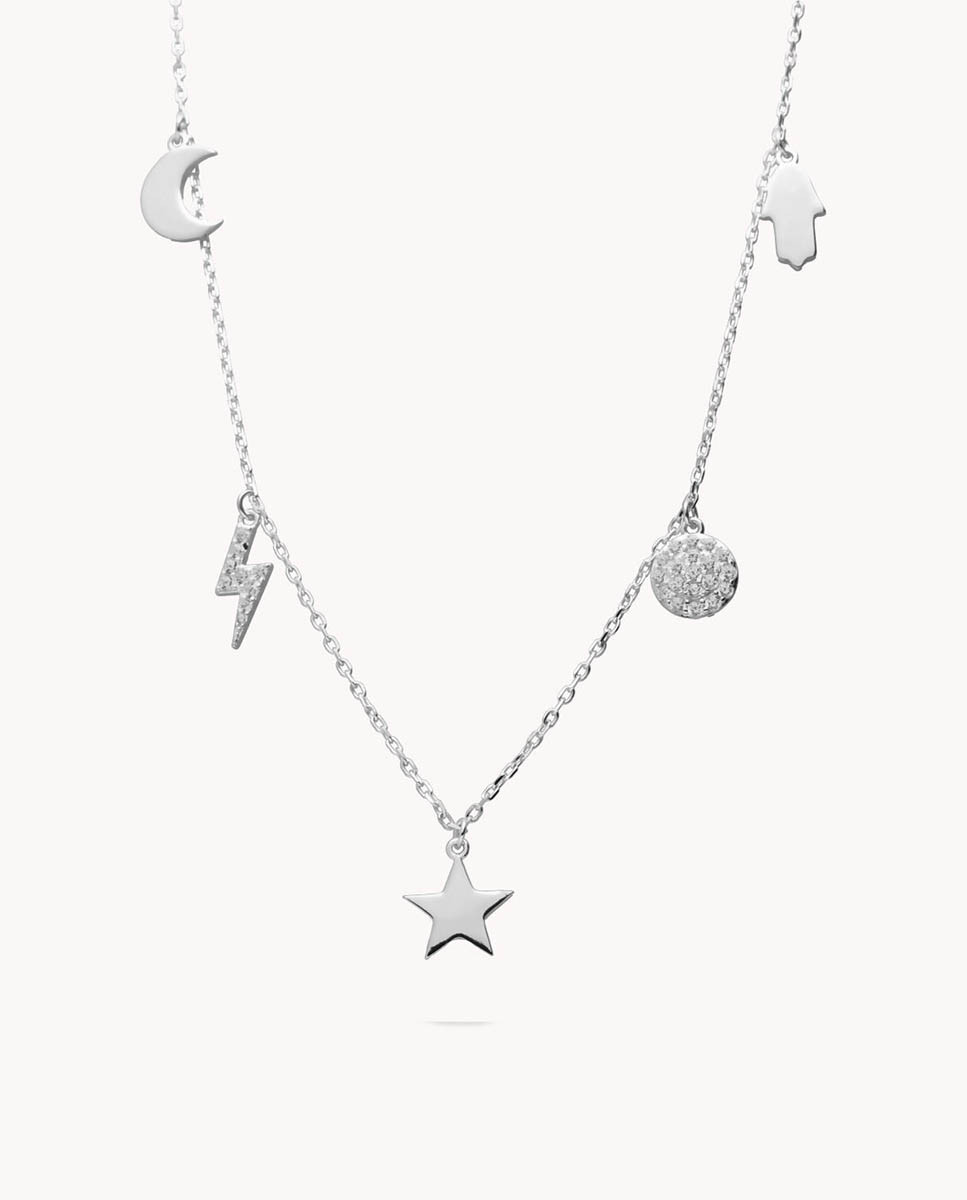 Collar de plata de ley 925 bañada en rodio con diferentes colgantes (mano de fátima, círculo,estrella, rayo y luna) combinados con circonitas blancas, cierre tipo reasa y largo de 40 cms más 5 cms de alargador.