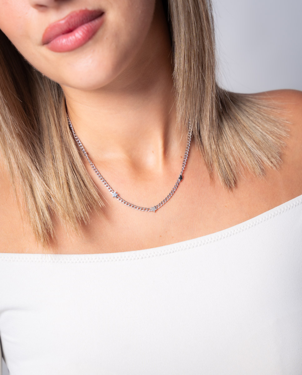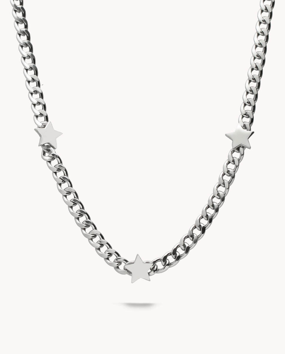 Collar de plata de ley 925 bañada en rodio con eslabón tipo barbado de 3 mm y motivos de tres estrellas, cierre de mosquetón y largo de 40 cms más 5 cms de alargador.